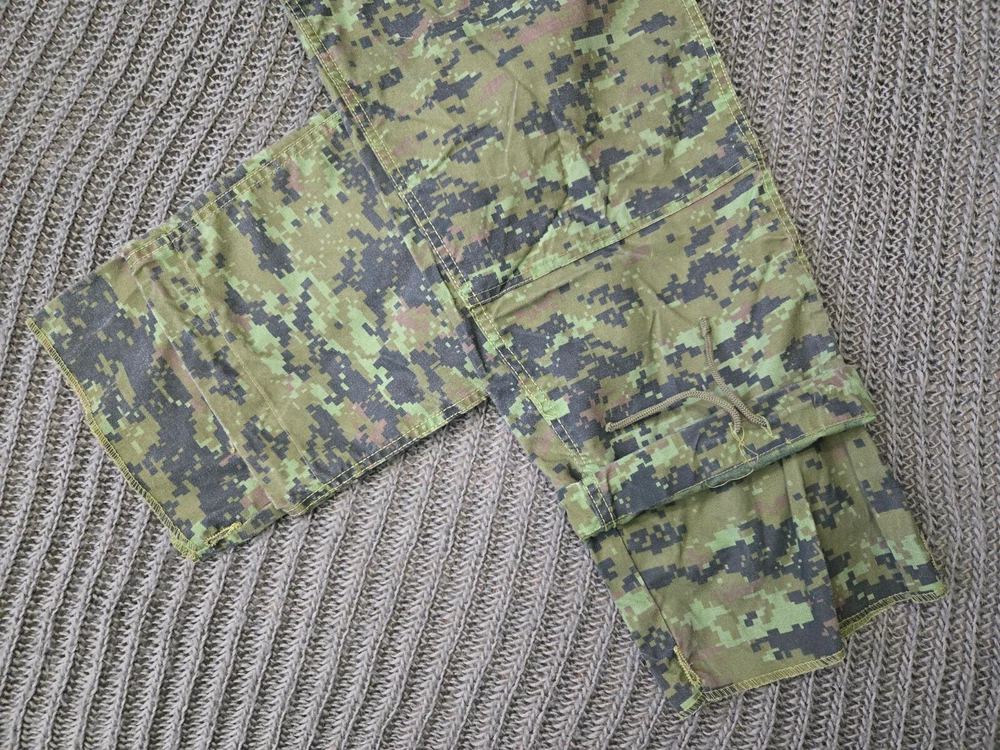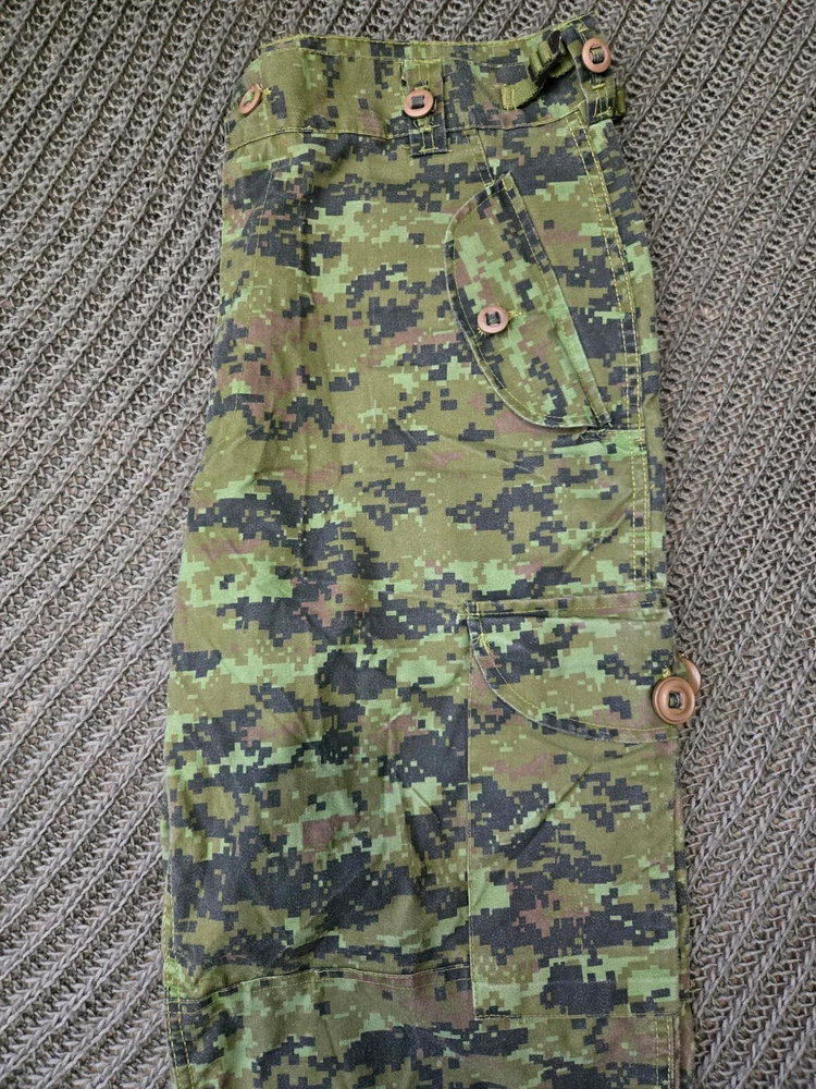 a modern military Uniform patterned after the Canadian 4 pocket CAFCU. printed in a digital woodland camo. This package includes a Jacket, Size Small-Regular, and a Pair of Trousers, Size Medium-Regular.