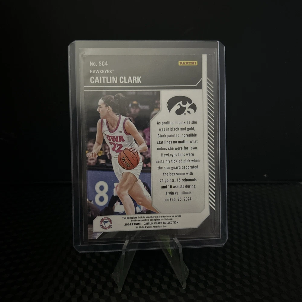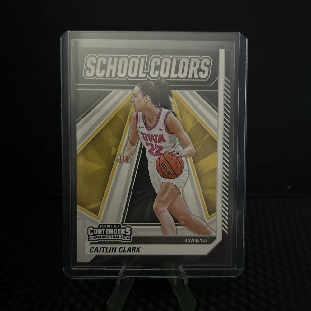 The product is a Caitlin Clark trading card from the 2024 Caitlin Clark Collection featuring the School Colors design. This ungraded sports trading card by Topps showcases Caitlin Clark, a player for the Iowa Hawkeyes in college basketball and the Indiana Fever in the WNBA. The card is in near mint or better condition and is part of an exclusive set, making it a desirable item for fans and collectors of women's basketball.
