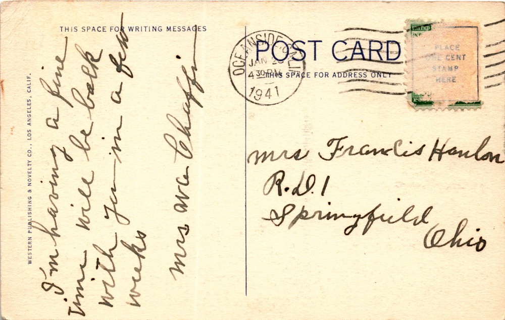 MAKE AN OFFER. THE MORE YOU BUY THE BETTER DEAL I WILL ACCEPT The postcard depicts a rose garden in California, with a message written on it from someone named Mrs. Francis Houlon. The postcard is from 1941 and was published by Western Publishing & Novelty Co. in Los Angeles, California.
