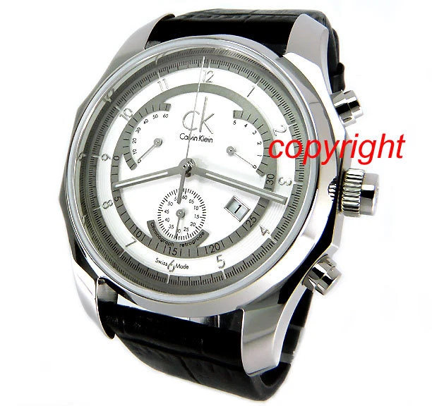 WE DO NOT SELL REPLICAS! 100% BRAND NEW AND AUTHENTIC! *SELLER RETIRING*SUPER CLEARANCE* MEN'S CALVIN KLEIN K7731120 SWISS MADE PRECISION SWISS QUARTZ MOVEMENT ACCURATE TO WITHIN 15 SECONDS MONTHLY 5 MINUTE RETROGRADE STOPWATCH SUB-DIAL 60 MINUTE RETROGRADE SUB-DIAL SMALL SECOND HAND SUB-DIAL WHITE DIAL LUMINESCENT HANDS DATE CALENDAR SAPPHIRE CRYSTAL SOLID STAINLESS STEEL CASE AND BUCKLE WITH ENGRAVED LOGO POLISHED/BRUSHED STEEL FINISH GENUINE BLACK LEATHER STRAP 30M WATER RESISTANT CASE MEASURES 42mm ACROSS EXCLUDING CROWN CASE IS 13mm HIGH LUG SIZE IS 22mm WEIGHS 2.8oz (80g) MAXIMUM WRIST SIZE IS 9" COMES IN CALVIN KLEIN PRESENTATION GIFT BOX MSRP $490