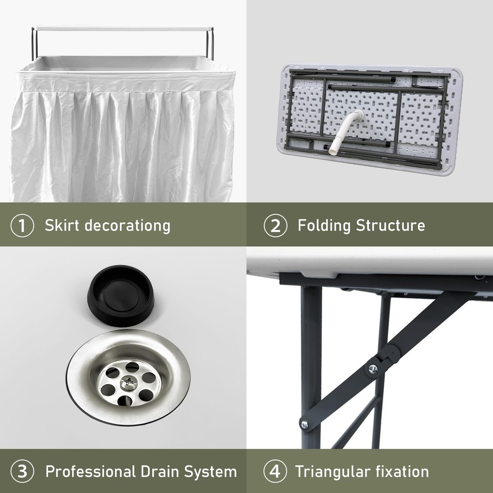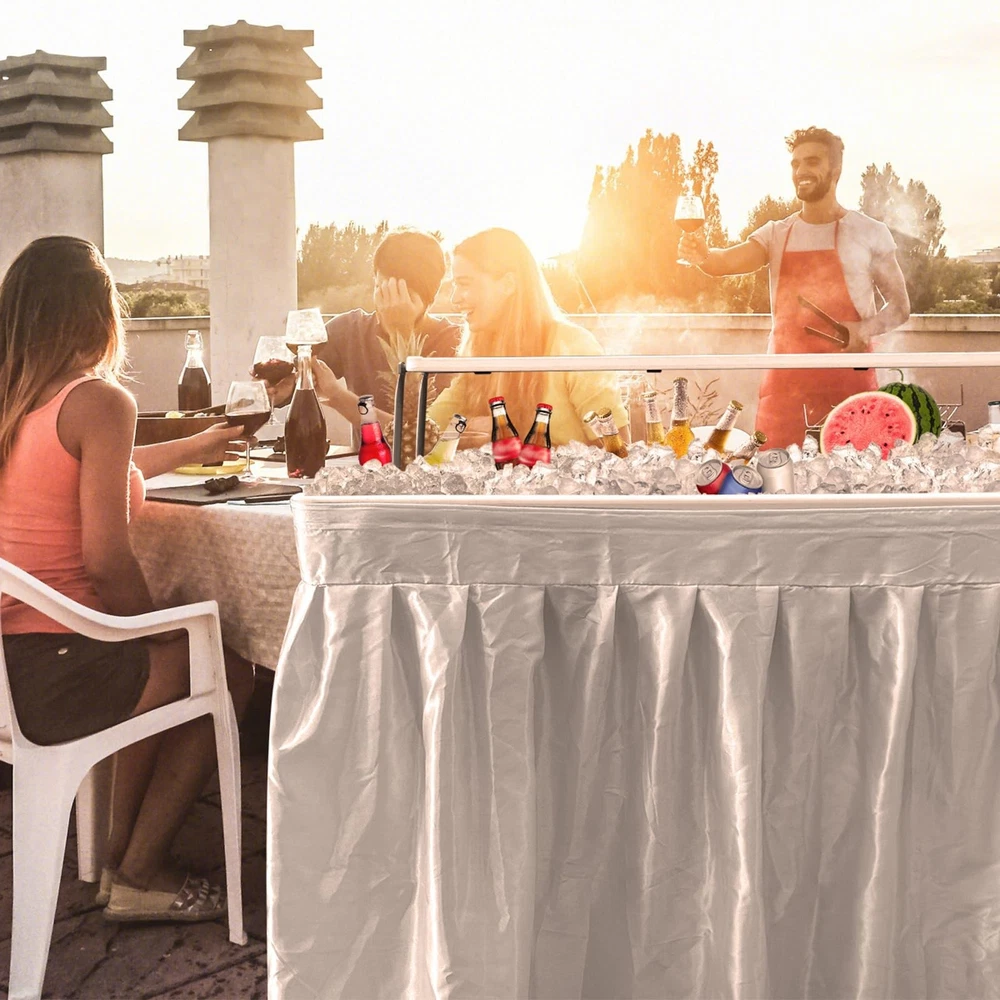 cooler table portable bar outdoor cooler table party tables drink table camping table portable bar table for events drink cooler drink cooler for parties cocktail tables for parties Keep your drinks cold and your guests happy with this convenient folding ice table with drain and skirt, perfect for outdoor parties and events Easily transport this portable bar and camping table to any location, whether it's a backyard BBQ or a camping trip The included skirt adds a touch of elegance to your setup, drink cooler for parties making it a versatile option for all types of gatherings Say goodbye to messy spills with the built-in drain, this party tables ensuring easy cleanup and maintenance at your next party Make a statement at your next event with this stylish and functional drink cooler that doubles as a cocktail tables for parties