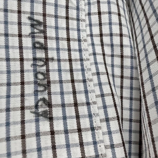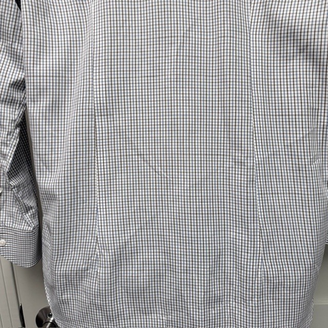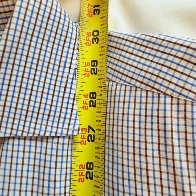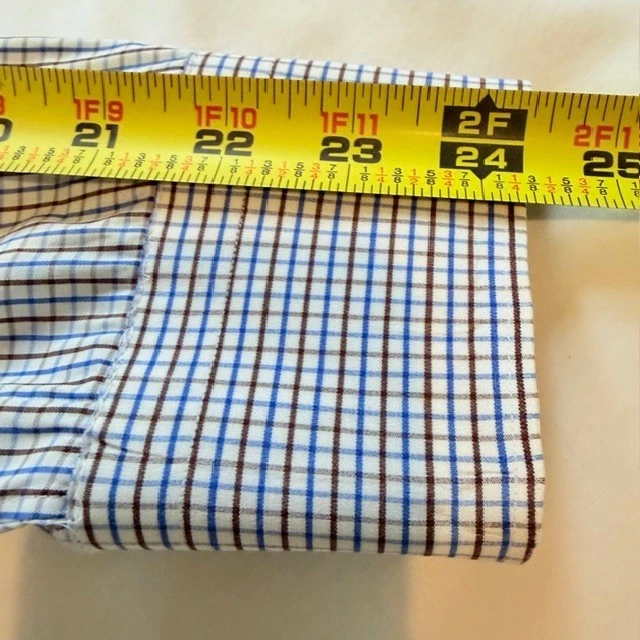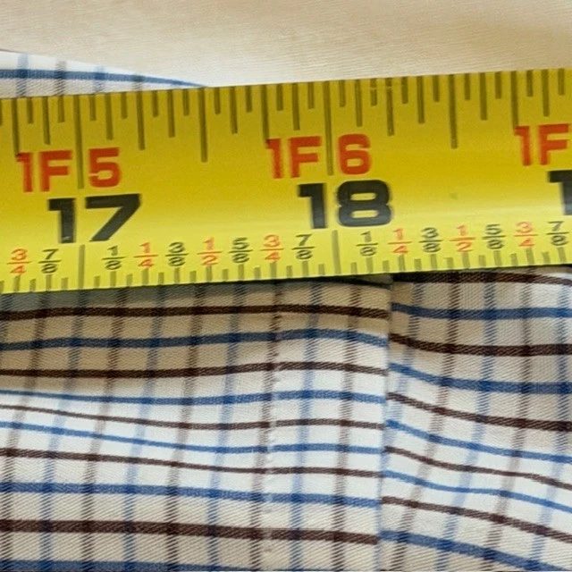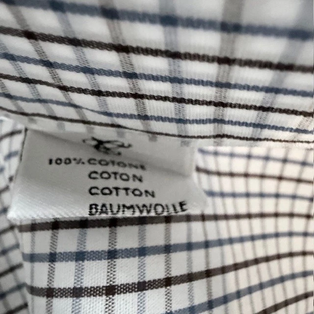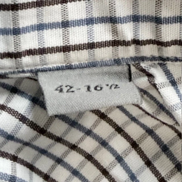 The CANALI Luxury Dress Shirt for men in size 42 and neck size 16.5 is a sophisticated and stylish choice for both casual and business occasions. Made from 100% cotton in a woven fabric with a light wash, this shirt features a classic collared neckline, button closure, and spread collar style. The white, blue, and brown check pattern adds a touch of designer flair, while the easy-care feature makes it convenient for everyday wear. With its Italian craftsmanship and high-quality materials, this shirt exudes a sense of luxury and refinement. Measurements: 30" long 18" shoulder 24" sleeves 23" pit to pit