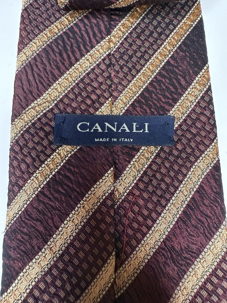 The CANALI Men's 100% Silk Necktie is a high-quality designer accessory exuding luxury and sophistication. Made in Italy with woven red and gold stripes, this classic tie measures 59" in length and 3 1/2" in width, making it a timeless piece for any man's collection. The Canali brand ensures exceptional craftsmanship and attention to detail, perfect for adding a touch of Italian style to any outfit.