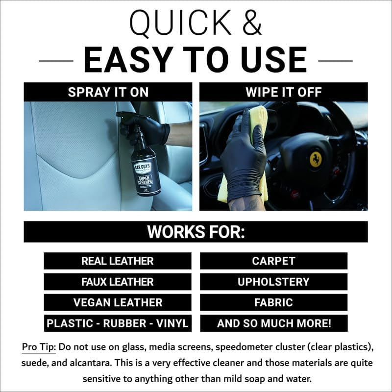 THE HYPE IS REAL! – Are you tired of using cleaners that work, but not as good as you expected?! You won’t experience that here! Our newly formulated multisurface cleaner is made with the newest advancements in nano-technology to effectively lift away dirt and grime at the molecular level. No more wasting time and energy with nonsense products made with old science and technology! REPLACE YOUR CABINET OF CHEMICALS! – Do you get confused by all the different types of cleaning supplies that are available? It gets frustrating fast! Just cleaning your vehicle requires some special deep stain remover, a chemical solvent to get rid of bug and tar, a separate floor mat and inner dash cleaner.. and the list goes on and on! Keep it simple with one multipurpose product, CAR GYUYS Super Cleaner... the KING OF ALL CLEANERS ! MULTI-SURFACE SUPER CLEANER! – This multi surface cleaner works on many different interior or exterior surfaces except glass and delicate instrument panel screens! That means this ONE PRODUCT will clean upholstery , fabric , canvas , leather , vinyl , plastic , rubber , bird poop , grease , tree sap , metals , wood trim and so much more! This is the most versatile multi-purpose cleaner on the market! WHY CHOOSE CAR GUYS? – We Care About Quality! Our products are made with the latest advancements in science, using the best equipment available. This helps us make consistently high quality products that always work great! Every formula we make is mixed and bottled, in the USA, by hard working Americans! REAL CUSTOMER SUPPORT! – The CAR GUYS team actually cares about customer satisfaction! If you ever have any concerns, let us know, and a person from our team will do everything in our power to make it right. Product Description The video showcases the product in use. The video guides you through product setup. The video compares multiple products. The video shows the product being unpacked. hero-video Merchant Video Premium Interior & Exterior Care for Your Car Add to Cart Add to Cart Add to Cart Add to Cart Add to Cart Add to Cart Customer Reviews 4.5 out of 5 stars 23,942 4.4 out of 5 stars 33,001 4.6 out of 5 stars 7,880 4.4 out of 5 stars 5,576 4.5 out of 5 stars 15,695 4.5 out of 5 stars 2,784 Price $16.99 $ 16 . 99 $16.99 $ 16 . 99 $17.99 $ 17 . 99 $15.99 $ 15 . 99 $19.99 $ 19 . 99 $24.99 $ 24 . 99 No Prop 65 Chemicals ✔ ✔ ✔ ✔ ✔ ✘ Description Safe & Effective Cleaner Restore Plastic Rubber & Vinyl No Sling Tire Shine Safe Wheel and Tire Cleaner Spray Sealant w/ Carnauba Wax High Gloss Polymer Car Wax User Friendly ✔ ✔ ✔ ✔ ✔ ✔ Applicator / Towel Included ✔ ✔ ✔ ✘ ✔ ✔ Made in the USA ✔ ✔ ✔ ✔ ✔ ✔ Available Sizes 18oz/128oz 8oz 18oz/128oz 18oz/128oz 18oz/128oz 8oz Is this only for automobile cleaning? No, this will clean many different things! Works GREAT around the house for cleaning a sofa or carpet. Clean outdoor accessories like a spa cover or sunbrella material. Excellent cleaner for your boats vinyl seats, mildew, and many other things! Can I use this to clean Glass or Navigation Screens? No, we recommend not using this on suede/nu-buck, glass, and delicate instrument panel screens like your cluster or navigation. When cleaning close to these areas, spray product directly onto the included towel to avoid any accidental over-spray. Does this require me to rinse away with water after, and is it safe and easy to use? Our Super Cleaner does not contain harmful Prop 65 Chemicals so it is safe and easy to use! Unlike other all-purpose cleaners that contain harsh chemical detergents which need to be rinsed off with water, this is safe, and does not need to be rinsed! Does this contain UV protectant shine? No, it’s strictly a cleaner. No residue or gloss is left behind, just leaves a new and super clean finish. I’m still not sure, can this really replace all my cleaners? Yes! This will replace about 80% of your cleaning products if not more. Use to clean every type of surface EXCEPT for suede/nu-buck, glass and delicate instrument panel screens like your speedometer cluster or navigation screen.