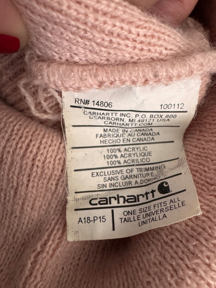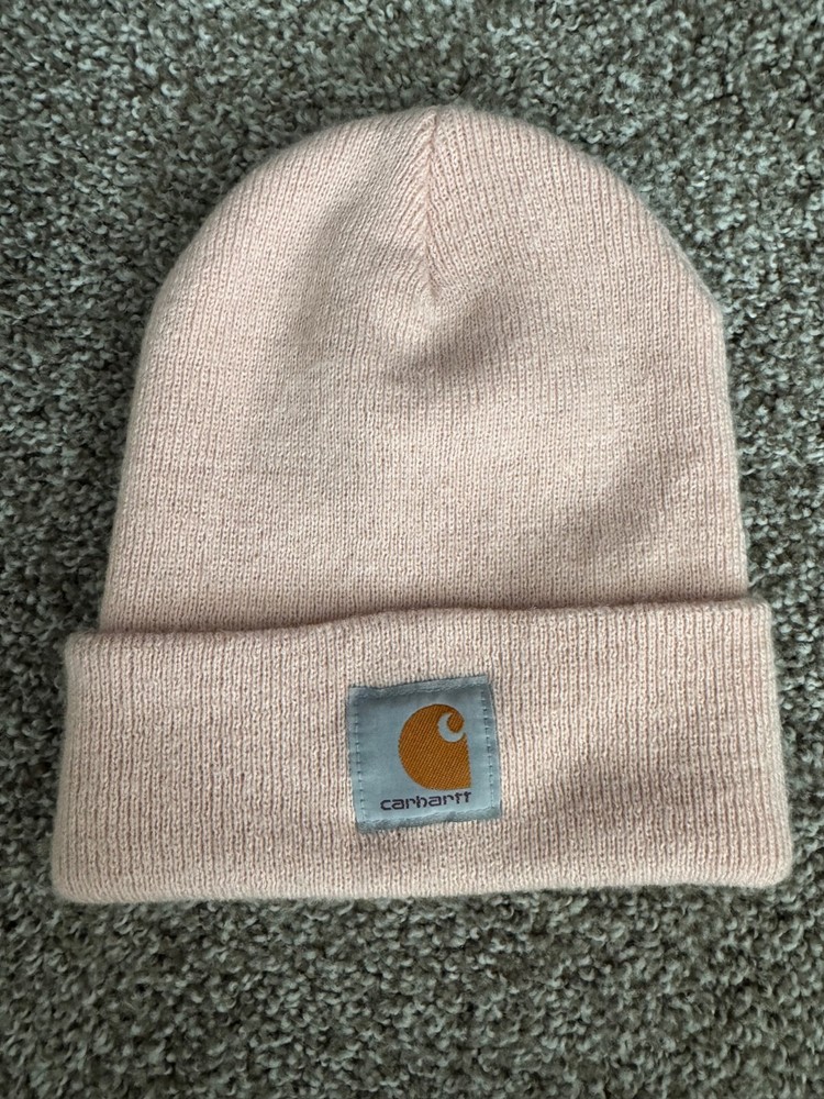 Carhartt Acrylic Watch Hat Beanie – Pink Stay cozy and stylish with this Carhartt acrylic watch hat in a soft pastel pink color. Made from durable stretchable rib-knit fabric, this beanie features the iconic Carhartt patch logo on the front cuff in orange and gray. Its classic fit makes it a go-to for cold weather, whether you're hitting the job site or just heading out on a casual day. Details: Brand: Carhartt Style: Acrylic Watch Hat Beanie Color: Pink (Pastel/Blush) Material: 100% Acrylic Logo: Woven Carhartt patch on front One size fits most Condition: Gently used, excellent condition – no stains, holes, or snags