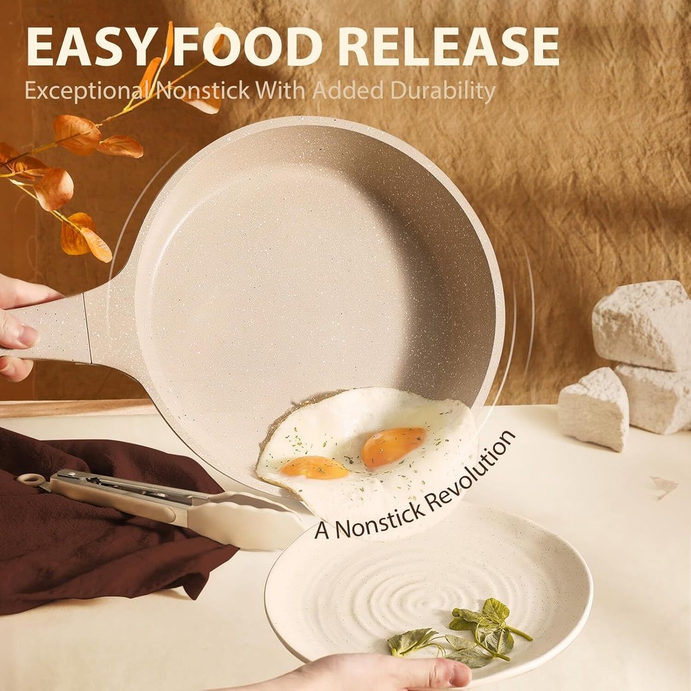 CAROTE 13pcs Kitchen Pots and Pans Set Non Stick, Taupe 13 Pieces, Product Details Material: Die Cast Aluminum Color: Taupe Brand: CAROTE Size: 13 Pieces Handle Material: Bakelite Is Dishwasher Safe: No Material Type Free: PFOA Free, PFOS Free Compatibility Options: All stoves compatible Number of Pieces: 13 Closure Material: Silicone Included Components: Lid Is Oven Safe: No With Lid: Yes Manufacturer: CAROTE Utensil Compatibility: Non-Metal Special Feature: Non Stick, All Stovetop Compatible, High cost-effective Package Dimensions: 15.63 x 12.76 x 7.72 inches Item Weight: 14.04 pounds Country of Origin: China Item model number: A10230 Everyday with High Quality Performance: This 13pcs meets all your requirements in kitchen, includes 6''/9'' frying pan, 1.6qt Sauce pan with lid, eggpan, 4.5qt Casserole with lid, 3qt Saute Pan with lid and 4pcs pan protectors. Long-last with Die-cast Aluminum Performance: The reinforced die-cast aluminum construction of this kitchen pots and pans set make it resistant to wear and tear, allowing it to withstand frequent usage without compromising its performance. Cook Without Worries:Our cookware sets are free of PFOA, PFOS. You can enjoy your cooking on carote cookware safely & easily. Fuss-Free Cleaning: Clean it just one wipe! Enjoy effortless cooking and cleaning with ultra-nonstick surface. Rapid & Even Heating: Die-cast aluminum body makes it with fast heat distribution so the same temperature everywhere on the pan while boiling, braising, simmering, reheating. Kindly note that we recommend not to use the smallest pan on induction for a better cooking experience.