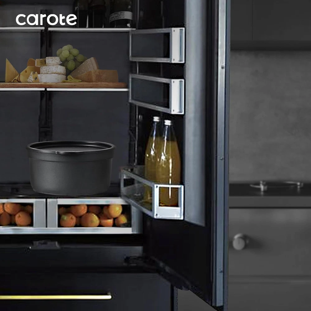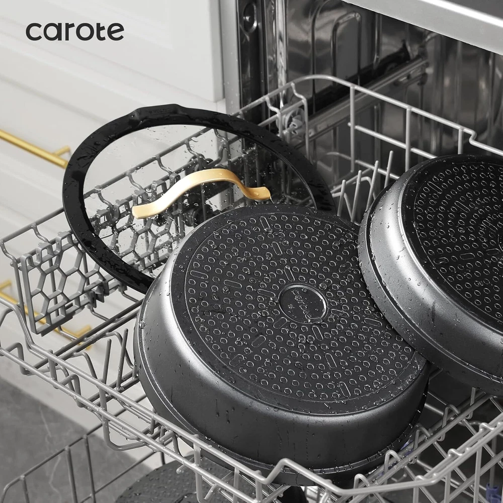CAROTE 20pcs Pots and Pans Set Non Stick, Nonstick Black Set, Product Details Material: Granite Color: Black Brand: CAROTE Size: 20pcs Black Set Handle Material: Bakelite with Silicone Is Dishwasher Safe: Yes Material Type Free: Cadmium Free, PFOA Free, PFOS Free, Lead Free Compatibility Options: Dishwasher Safe, All Stoves Compatible Number of Pieces: 20 Closure Material: Granite Nonstick Included Components: 10'' saute pan, 4*pan protectors, 2*utensils, 2*handles, 10''/9'' fry pans, 3*trivets, 1*stand, 7*storage lid, 10''/9'' silicone lid, 4qt/2qt sauce pans Is Oven Safe: Yes With Lid: Yes Manufacturer: CAROTE Special Feature: Gas Stovetop Compatible, Electric Stovetop Compatible, Can be used in the fridge, Induction Stovetop Compatible, Can be used in the oven Product Dimensions: 11 x 6.6 x 3 inches Item Weight: 13.2 pounds Country of Origin: China Item model number: cookware set - : Optimal storage and easy stacking with the handles off saves up to 70% more space of Carote detachable handle pots and pans set. - : As both a cookware set and a dinnerware set, 1-time cleaning for all. Cleanup with ZERO elbow grease thanks to the nonstick granite. : Removable handle for the ultimate versatility– go from ALL kinds of hobs to the oven, to the grill, to the fridge, and onto the table in a click. ’ : Balanced convenience-rich features, rapid&even heat transfer, and nonstick performance as the same as other Carote cookware sets.