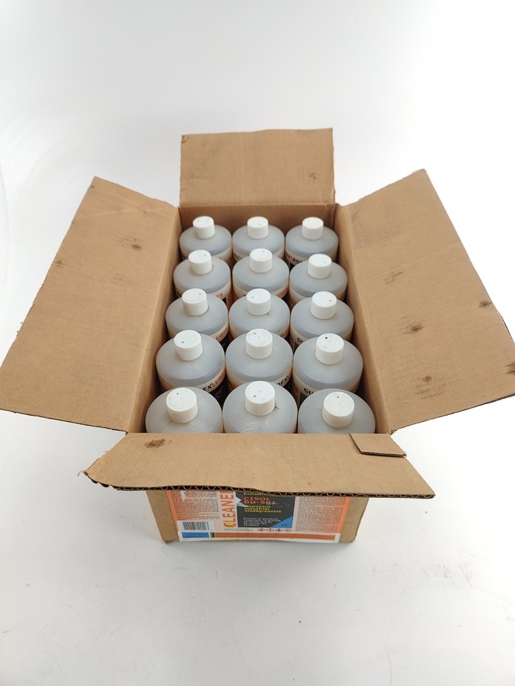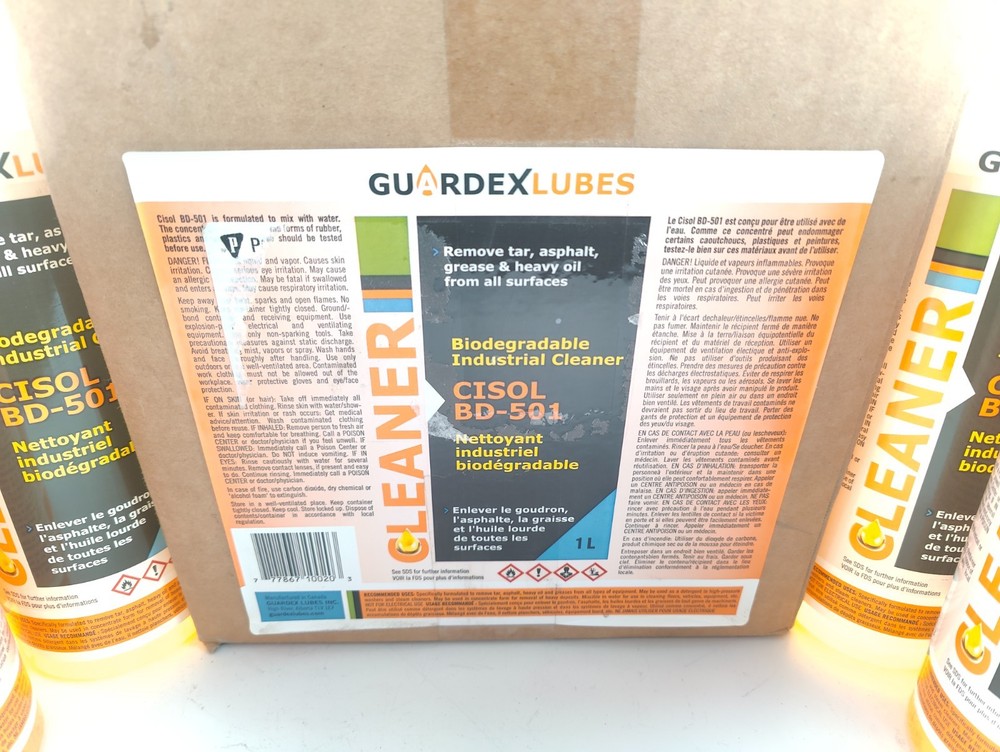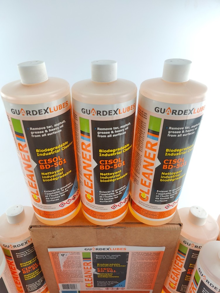 CASE OF 15 1L bottles (15 LITERS TOTAL) GUARDEX CISOL BD-501 Biodegradable Industrial Cleaner, Organic Solvent (CONCENTRATE - JUST ADD WATER TO USE) New - unused - open box, outer box is worn/stained/dirty GUARDEX’s CISOL BD-501 is a biodegradable, organic solvent blended with surfactants and manufactured with the environ ment in mind. It was designed as a superior cleaning agent which is miscible with water. It contains no phosphates and is non-corrosive, non-caustic and non-acidic. Highly effective in removing even the toughest oil and grease and is more powerful than most detergents used for similar applications. DIRECTIONS FOR USE: can be used full strength or mildly diluted in most situations. For cleaning baked on grease and oil from tools and equipment, spray a small amount and wipe clean. For tougher build up, a second application may be required. Can be sprayed onto wellheads and pumping units to remove grease, wax and oil. Concentrated application is suggested. Soak bitumen laden equipment in CISOL BD-501 full concentrate and rinse with water. It can be separated from water for limited recovery by settling. Use in high pressure washers or steam units to remove wax, sludge, bitumen and oil from vessels and storage tanks. Add to process vessels and circulate through (clean up with fresh water prior to refilling process fluids). CAUTION: CISOL BD-501 may affect certain rubbers, plastics and paints and should not be used on fresh paint. Testing on these materials is recommended. Testing conducted on Buna, Viton, Neoprene and tire rubbers has not proven harmful. Should be washed off painted equipment within 30 minutes to avoid potential damage. See SDS for more information.