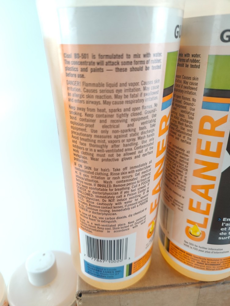 Seller Notes: “New - unused - open box, outer box is worn/stained/dirty” Number in Pack: 15 Type: Biodegradable Industrial Cleaner Brand: GUARDEX LUBES gtin13: Does not apply MPN: BD-501 Country of Origin: Canada UPC: Does not apply Features: Biodegradable For: Hard Surface Form: Liquid