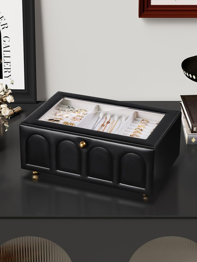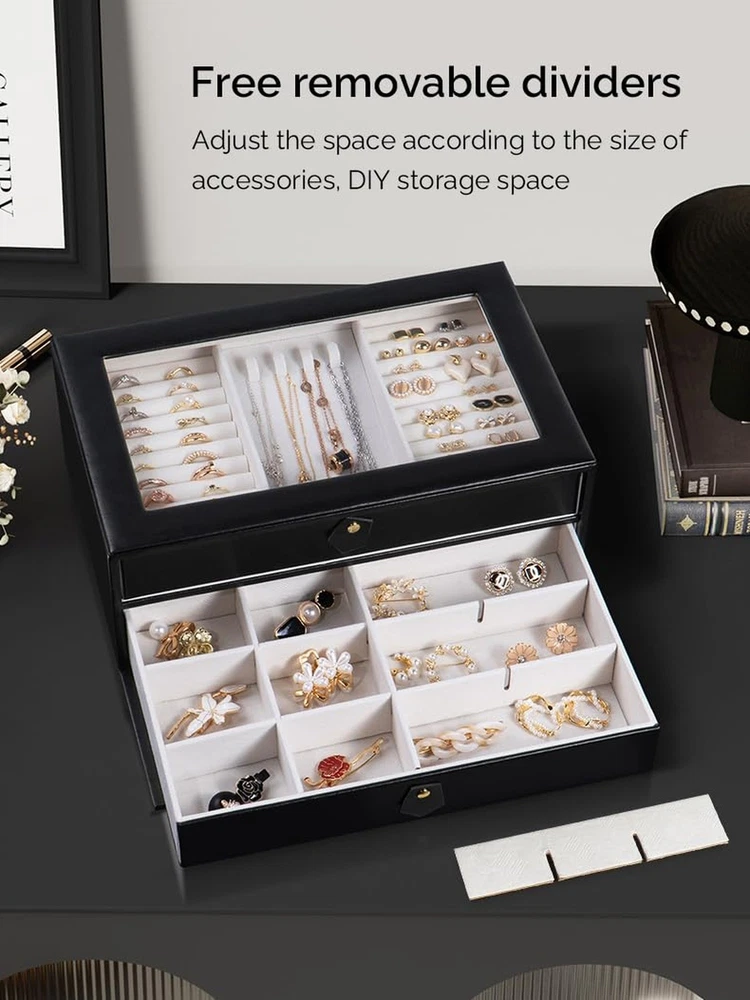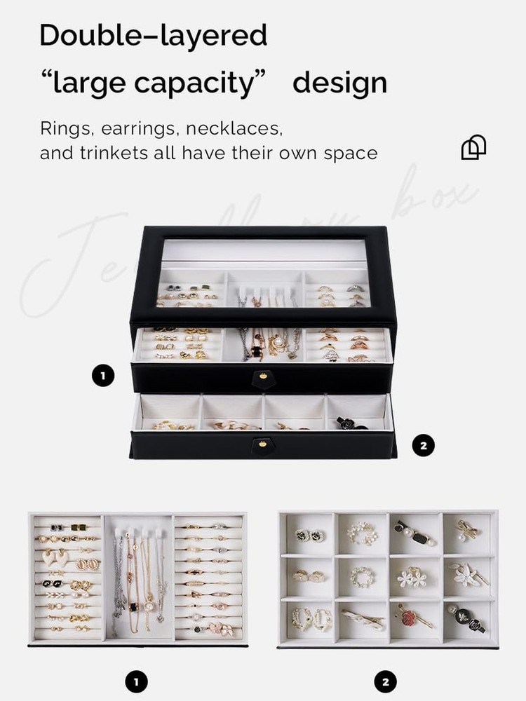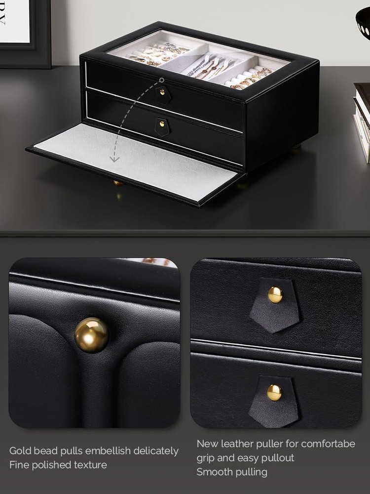 CASEGRACE Jewelry Box for Women, 2 Layer Double Drawer Jewelry Organizer Glass Lid, Large Jewelry Display Case for Necklace Bracelet Earrings Rings Storage for Dresser, Black - Buy Now with Fast Shipping! CASEGRACE Jewelry Box for Women, 2 Layer Double Drawer Jewelry Organizer Glass Lid, Large Jewelry Display Case for Necklace Bracelet Earrings Rings Storage for Dresser, Black Product Details Brand: CASEGRACE Style: Modern Special Feature: Adjustable Product Dimensions: 11.8"D x 4.3"W x 7.9"H Shape: Rectangular Finish Type: Leather-like Inner Material: Velvet Number of Drawers: 2 Number of Compartments: 2 Jewelry Storage Type: Jewelry Box Brand: CASEGRACE Style: Modern Special Feature: Adjustable Product Dimensions: 11.8"D x 4.3"W x 7.9"H Shape: Rectangular Finish Type: Leather-like Inner Material: Velvet Number of Drawers: 2 Number of Compartments: 2 Jewelry Storage Type: Jewelry Box Manufacturer: CASEGRACE Occasion: Mother's Day Mounting Type: Table Top Closure Type: Flip Top Lid Part Number: sp01321hs Item Weight: 3.19 pounds Country of Origin: China Item model number: sp01321hs Finish: Leather-like Special Features: Adjustable Included Components: Jewelry Box Batteries Included?: No Batteries Required?: No Date First Available: October 10, 2024 Key Features ✅ French retro style: draws on the essence of French classical architecture and decorative arts using arches of luxury minimalist design, elegant and romantic, exquisite craftsmanship, to create a romantic atmosphere of the palace-style ✅ Transparent windows make it easier to find your favorite jewels before you open it. You can use it in many situations such as living room, bedroom, wardrobe, jewelry store, never messy dressing table anymore. ✅ Durable Material&Perfect Size: Made of premium PU leather, great texture and stain resistant, with soft velvet lining, protect your jewelry from dust and scratch. Attractive surface, durable quality. Dimension: 11.81x 7.87 x 4.33 inch (L x W x H) . ✅ Multifunction Storage&Double Drawer: Double layers jewelry organizer box contains grids with different size to store all kinds of jewelries or cosmetics. Dividers in the drawers all can be removed to meet your different needs. ✅ Best Gift Choice: Jewelry display box will be a wonderful gift for Valentine's Day, Mother's Day, Thanksgiving, Christmas gift for her, birthdays and weddings for mom, girlfriend, colleague or someone special in your life. Product Description