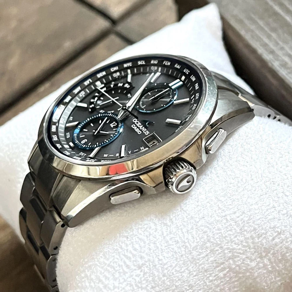 Watch Shape: Round Case Size: 40mm With Original Box/Packaging: Yes Band Color: Silver Movement: Quartz Case Material: Titanium Max Wrist Size: 190mm Country/Region of Manufacture: Japan Type: Wristwatch Display: Analog Case Color: Silver Bezel Color: Silver Model: OCEANUS OCW-T2600-1AJF Style: Casual Dial Color: Black Brand: CASIO Department: Men Band Material: Titanium Reference Number: OCWT26001AJF