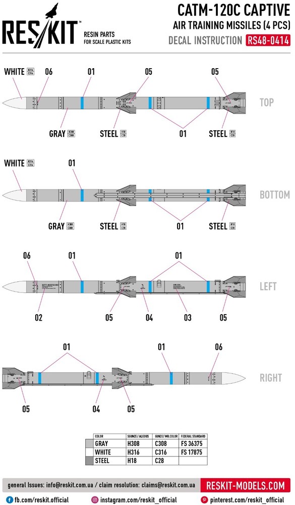 CATM-120C Captive air training missiles (4 pcs) (F-15, F-16, F-18,F-22, JAS-39, Eurofighter) (3D Printed) ResKit RS48-0414 - for Plastic Model Kit Enhance Your Scale Models with ResKit | High-Quality Resin & 3D-Printed Accessories RESKIT - Accessories for Scale Plastic Kits Upgrade your scale model collection with high-quality resin parts from ResKit. Our Ukrainian-made parts are meticulously crafted to provide the most accurate and detailed representation of original components. Whether you're building aircraft, helicopters, military vehicles, or figures, ResKit has the perfect parts to enhance your project. Scale: 1/48 Manufacturer: RESKIT (Accessories for Scale Plastic Kits) Country/Region of Manufacture : Ukraine Condition : New in Box Category: Resin & 3D accessories Type of equipment : Aircraft Type of product: Arms and weapons Recommended kit: Any CATM-120C Captive air training missiles (4 pcs) for aircraft model kit: F-15 F-16 F-18 F-22 JAS-39 Eurofighter ResKit is a Ukrainian manufacturer of high-quality resin parts and accessories for scale models . The products are distinguished by a high level of detail and accuracy, which allows modelers to create the most realistic models of military equipment, aviation and other objects. Key Features: Premium Quality: Our resin parts are made with the finest materials and precision engineering. Extreme Detail: Experience unparalleled detail and realism in your models. Wide Range: Choose from a vast selection of parts for various scales and subjects. Easy to Assemble: Our parts are designed for easy integration into your existing model kits. Superior quality! ResKit parts allow you to create a model with incredible detail. ---------------------------- >>> Visit our eBay store! <<< You will find everything you need at great prices. Scale model accessories are a wide range of parts, spares, and components that can help you make your model even more realistic and detailed. In our catalog, you will find everything you need to assemble and repair model cars, airplanes, ships, tanks, and weapons. Our accessories are made from high-quality materials and meet all standards. We offer a wide range of models and sizes so you can find what you need. Buy scale model accessories in our store and make your model even more unique!