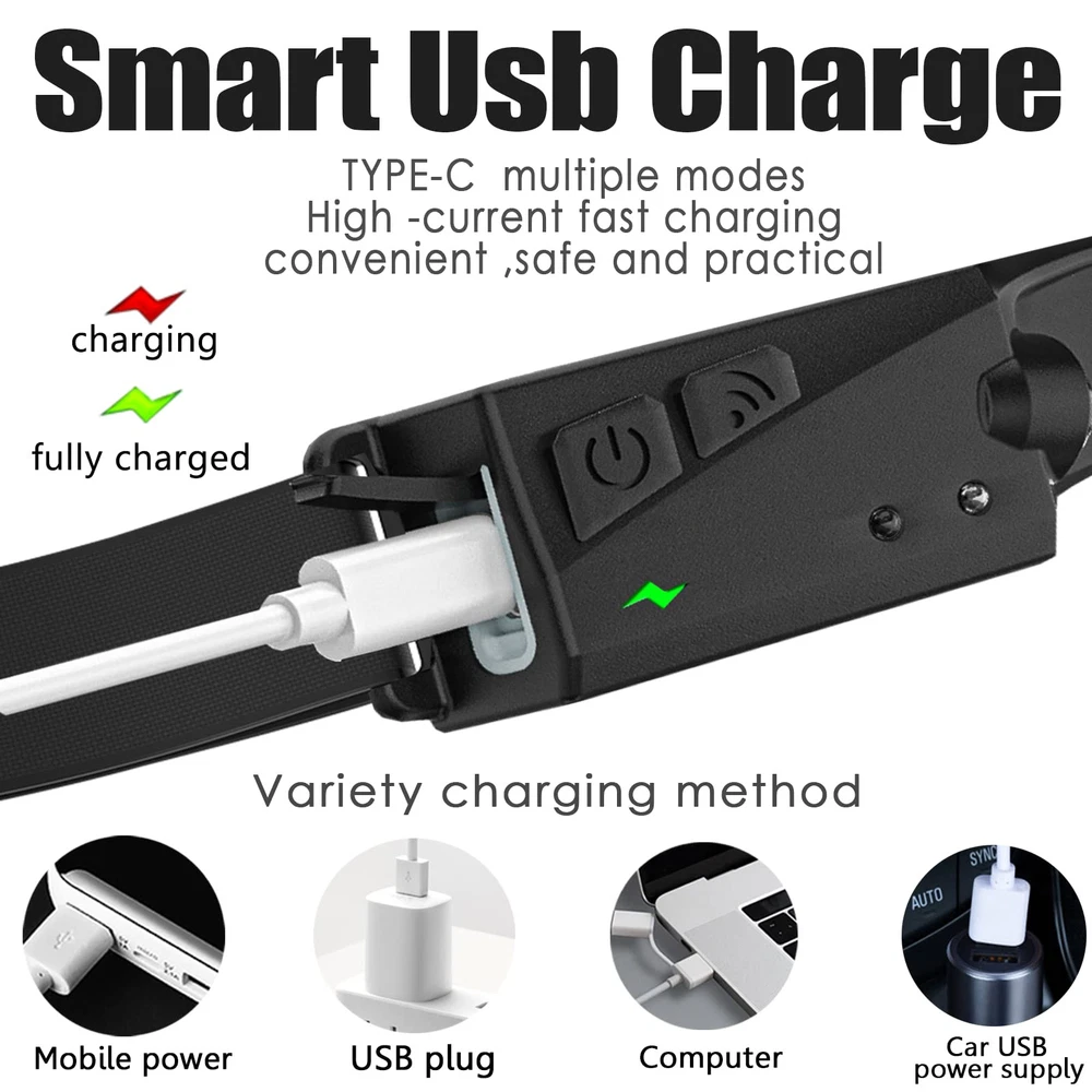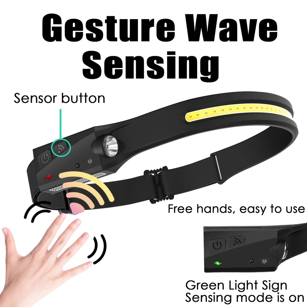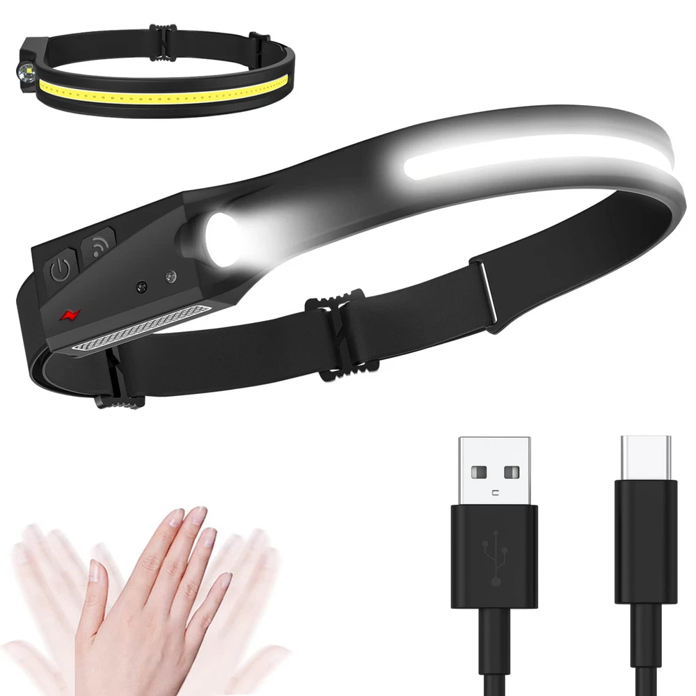 【Cob surface flood light source】: 3 mode level high low SOS, strong and soft light for choice according to your various lighting needs. Cob strap provide 230-degree wide vision illumination angle, wide illumination range, bright and not dazzling. 【2 light source Switch】: Front LED Cob strap for flood vision, side light spotlight vision. Simply press the button to switch between the 2 mode. The side light with projector for focus strong beam, can reach to 100 meters illumination. 【Lightweight and Convenient】: Lightweight hand free: the head light with soft silicone, lightweight, cotton elastic brand, length adjustable, comfortable to wear. Even if kids wear it, feel nothing. Hand wave sensing avoid hassle to find button while working. 【Easy to Charge】: Built in USB charging 1200ma battery,easy to charge with any USB port. Need to charge when the indicator show red. While charge the indicator show green. 【Hands free for working】: IPX4 waterproof headlamp, no worry in rainy snow weather. Suitable for maintenance work, outdoor sports, night cycling, night running, camping, night fishing, emergency situations, etc. One year hassle free in case of any quality issue to make your purchase risk fee.
