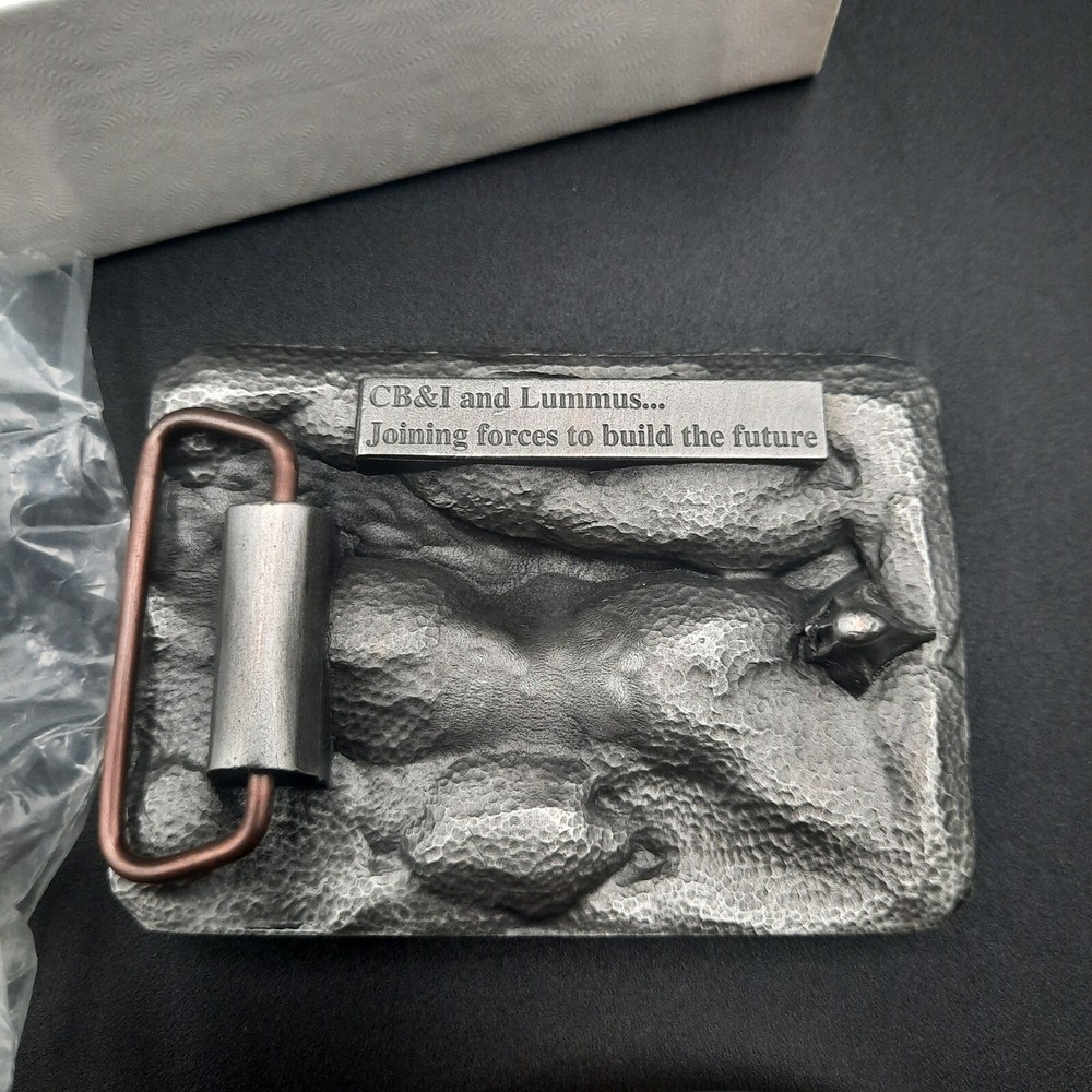 This detailed CB&I and Lummus belt buckle commemorates their 2007 partnership, marked by the engraved phrase "Joining forces to build the future." The buckle is crafted from a silver-tone metal with intricate raised industrial imagery and detailed logos. It features an oval front with a textured background and gold-tone accents, including the phrase "Working Safe Together" with industrial icons. The back is equipped with a sturdy clasp and loop for secure wear. This buckle is a perfect collectible for industrial enthusiasts or as a unique statement piece. Color: Gold Accents: Logo, Buckle, Medallion Type: Belt Buckle Department: Men Material: Metal, Zinc Alloy, Copper Style: Western Buckle Pattern: Solid Keywords: CB&I, Lummis, Belt Buckle, Working Safe Together, 2007, Limited Edition, Commemorative, Industrial, Collector's Item, Vintage Buckle