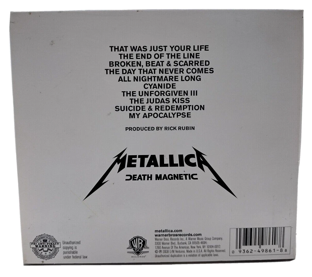 CD Grading: Very Good (VG) Release Year: 2008 UPC: 093624986188 Type: Album Artist: Metallica Format: CD Release Title: Death Magnetic Case Condition: Very Good (VG) gtin13: 093624986188 Record Label: Warner Bros. Genre: Rock, Heavy Metal Case Type: Jewel Case: Standard