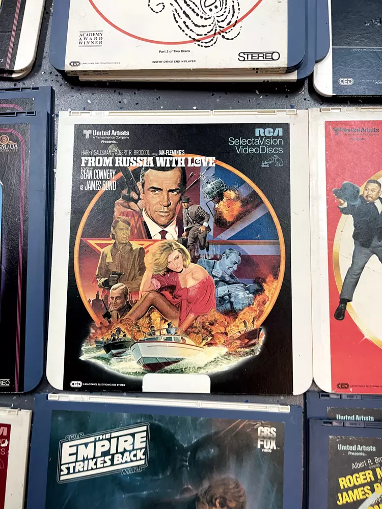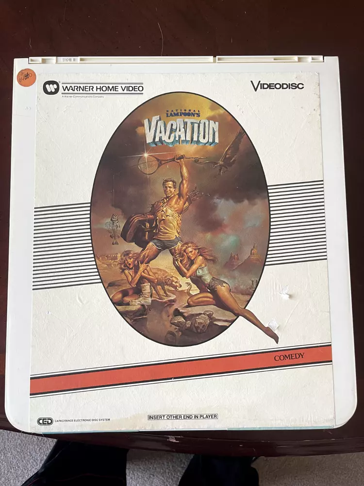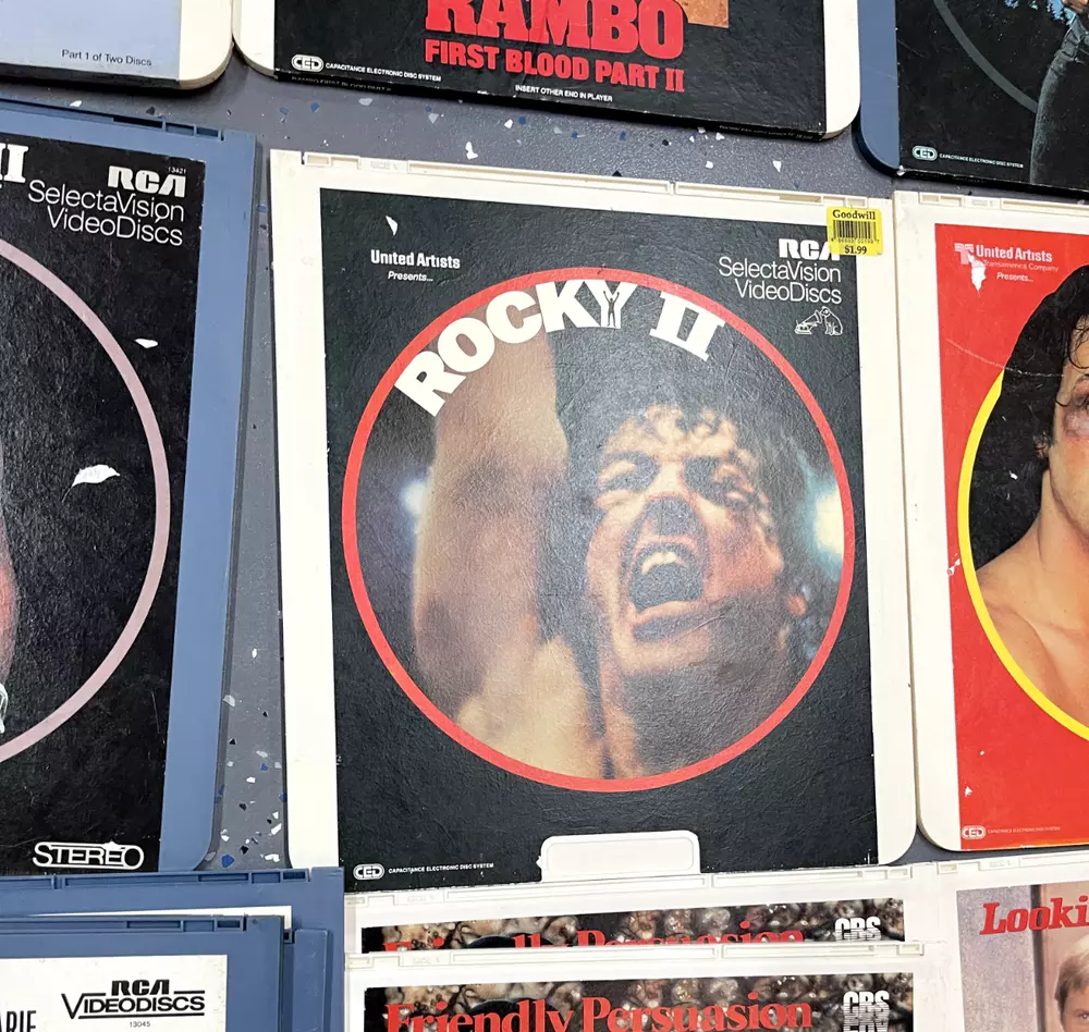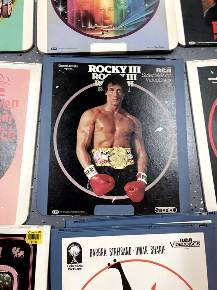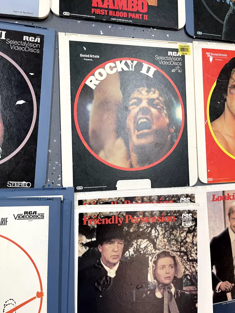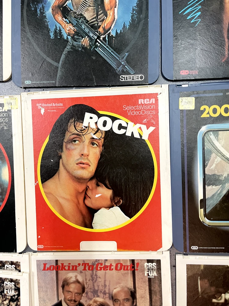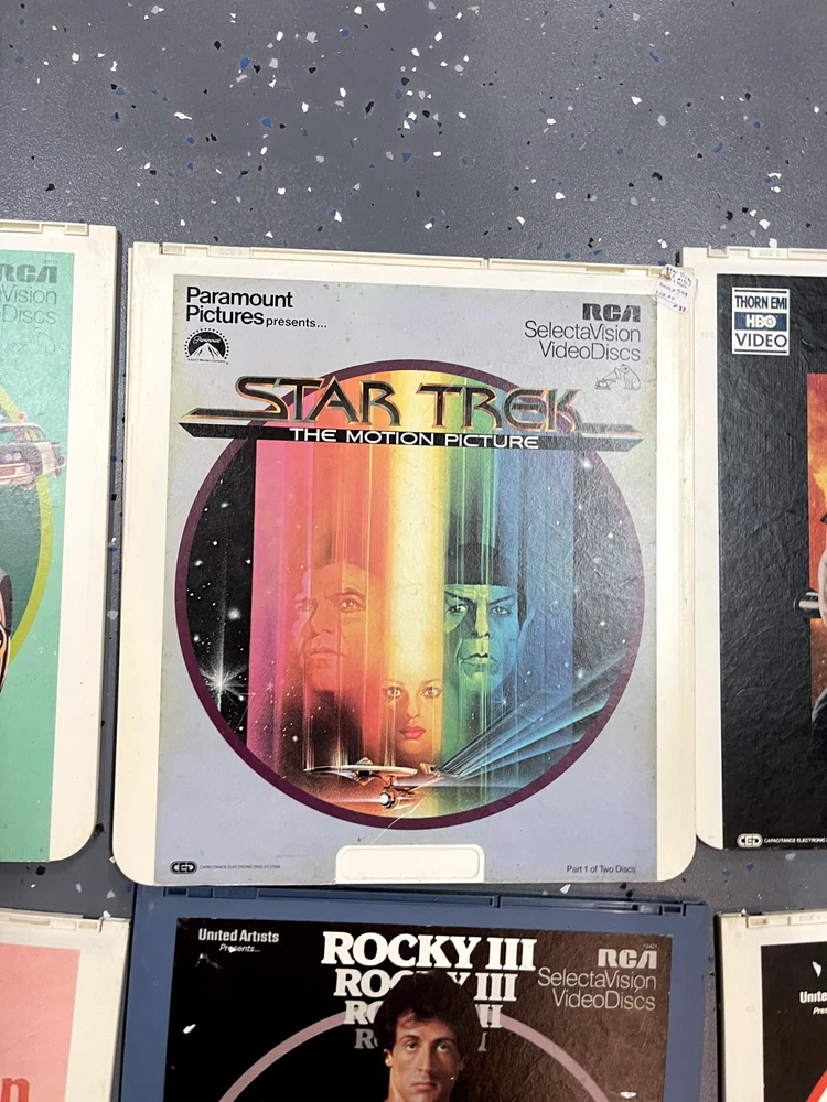The product is a CED Selectavision Video Disc featuring a selection of SciFi, Action, and Drama movies such as Star Trek Empire strikes back, Rocky and Rambo. It allows you to choose your own movie from a variety of genres including Western, Musical, and Comedy, produced by Walt Disney Studios.
