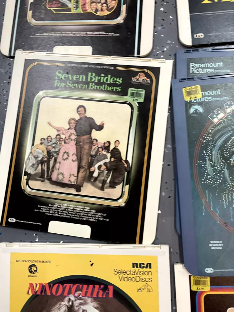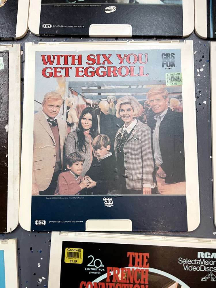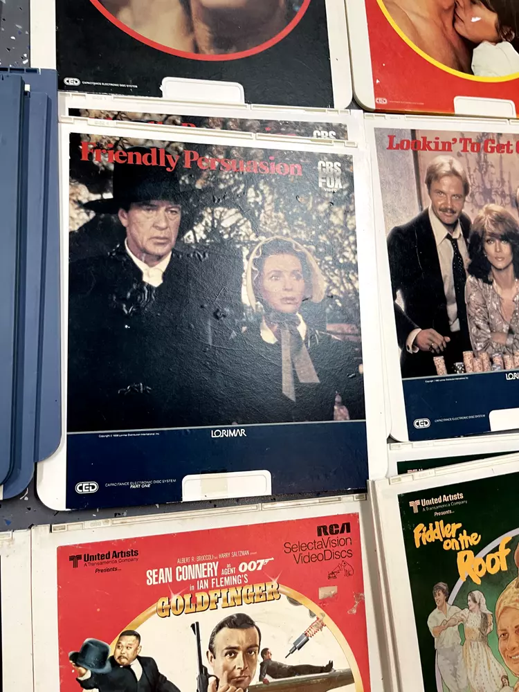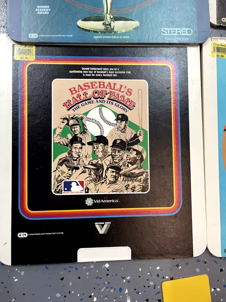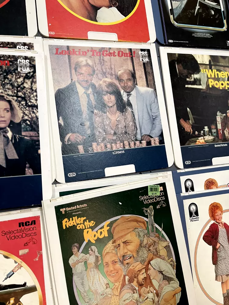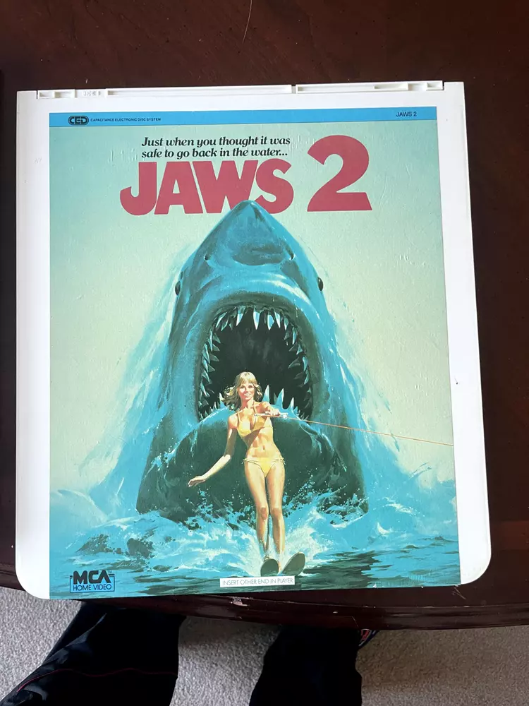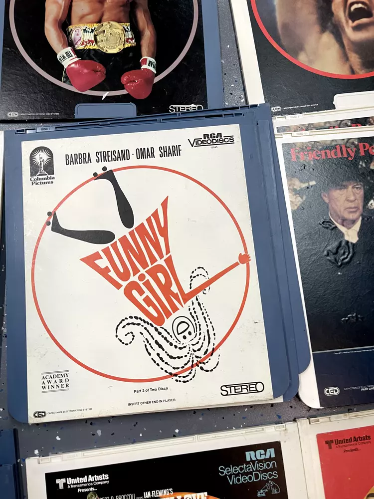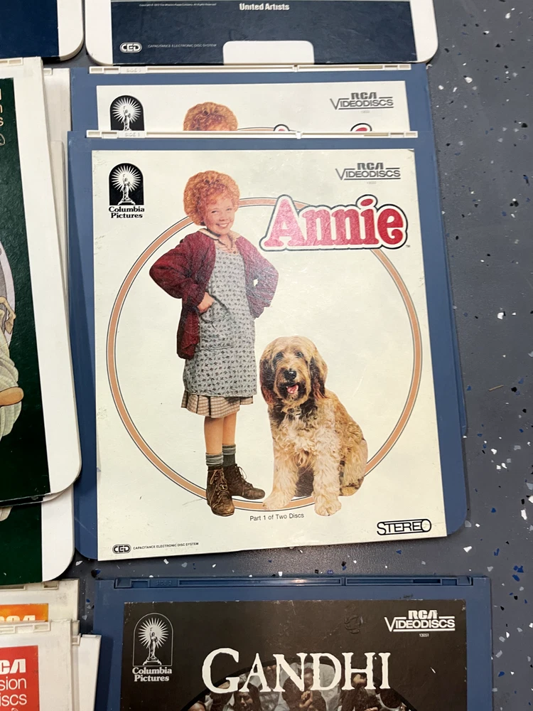 The product is a CED Selectavision Video Disc featuring a selection of SciFi, Action, and Drama movies such as Star Trek Empire strikes back, Rocky and Rambo. It allows you to choose your own movie from a variety of genres including Western, Musical, and Comedy, produced by Walt Disney Studios.