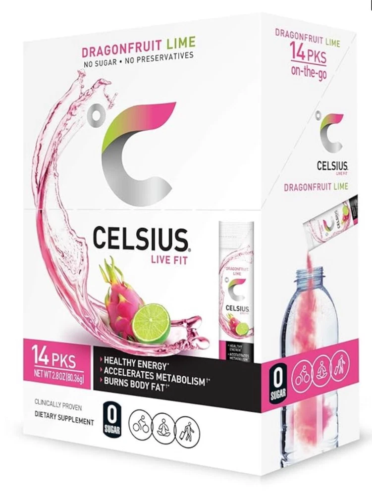 Supply:N/ANumber of Pills:28 TubesIngredients:Dragon fruit lime and Cranberry limeType:DrinkWhen to Take:Before WorkoutBrand:CelsiusMPN:N/AFlavor:Dragon fruit and cranbery limeActive Ingredients:Immune System SupportMain Purpose:Immune System SupportFeatures:All Natural, Green tea with EGCG, Ginger, & Guarana seedFormulation:Powder
