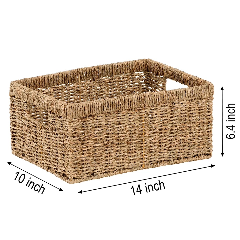 Large Basket 14 x 10 x 6.4 inches Woven by hand from natural seagrass over an iron frame in Vietnam Used as a storage basket for fruit, books, magazines, newspapers, games, pet toys, media, towels, clothes, toilet paper, or others Perfect for organization and storage with closets, shelves, racks, drawers, desks, pantries, bar counters, coffee tables, and more The basket is a great choice to decorate and organize your living space such as home, kitchen, office, restaurant, hotel, or garden Our open rectangle baskets are easy for organizing with insert handles. They can be used the same as containers, holders, trays, bins, or boxes anywhere in your home like in the living room, bedroom, bathroom, playroom, laundry room, and kitchen. Our weaving baskets are mainly handmade of all-natural and easily renewable materials like bamboo, rattan, wicker, straw, jute, seagrass, and water hyacinth with metal wire frames inside. We are proud to be the brand that has been supporting the local craftsmen and introducing their products to the world.