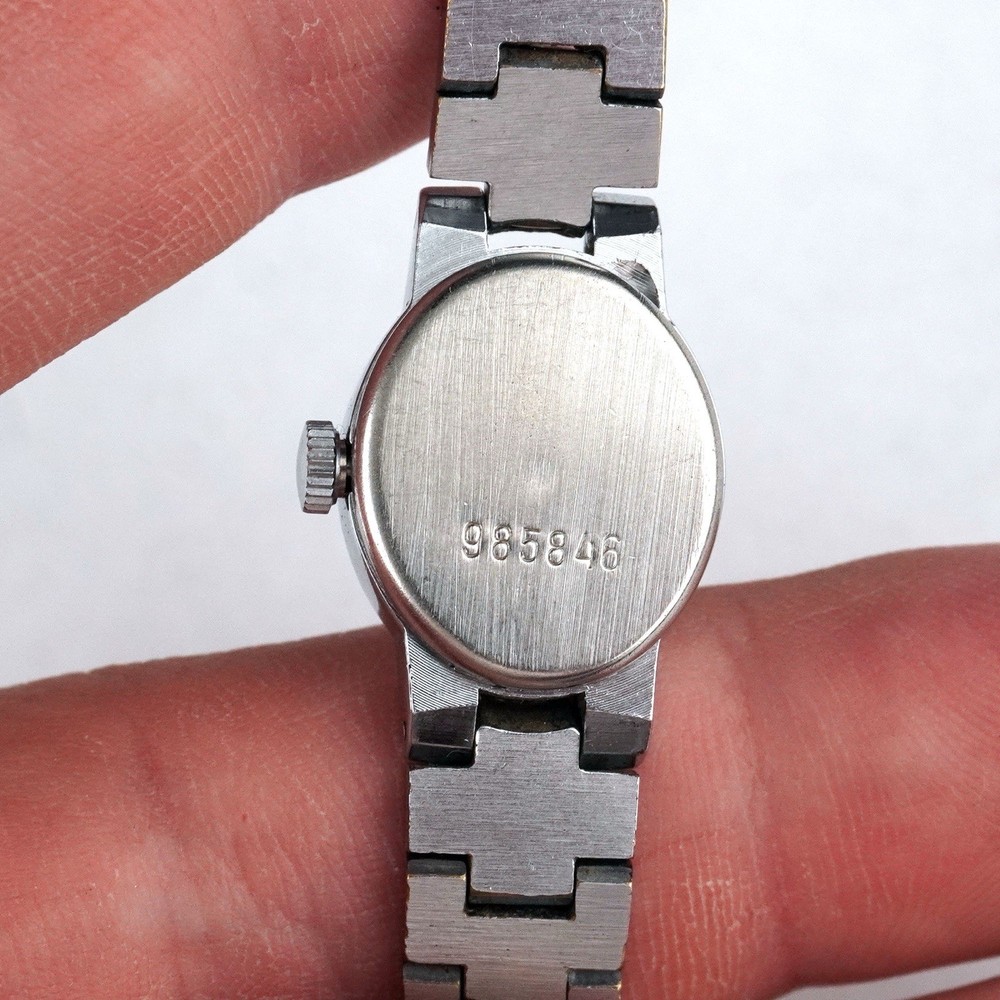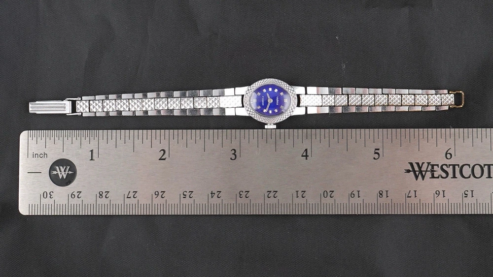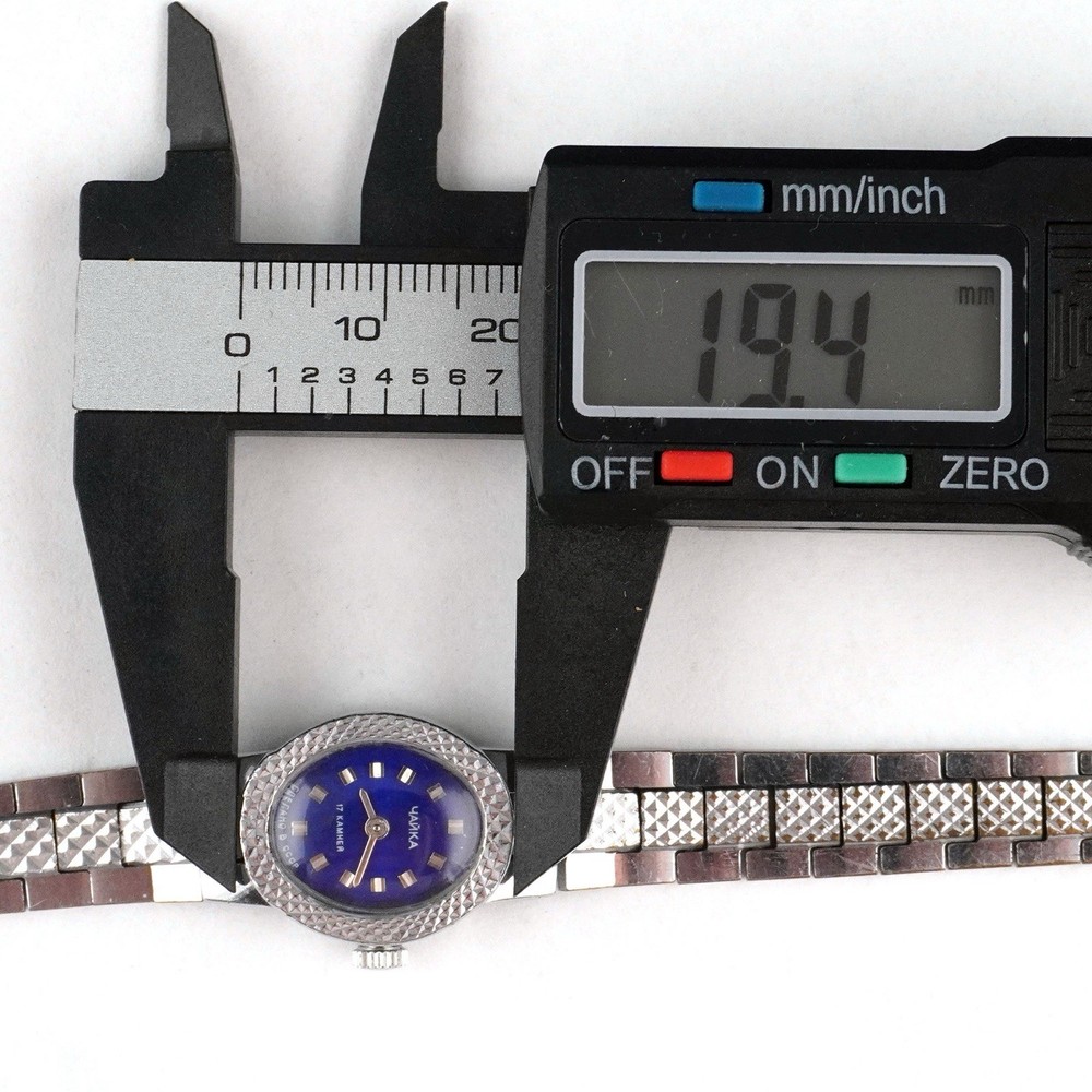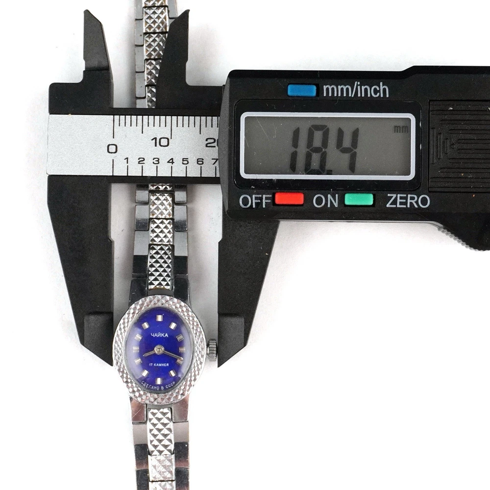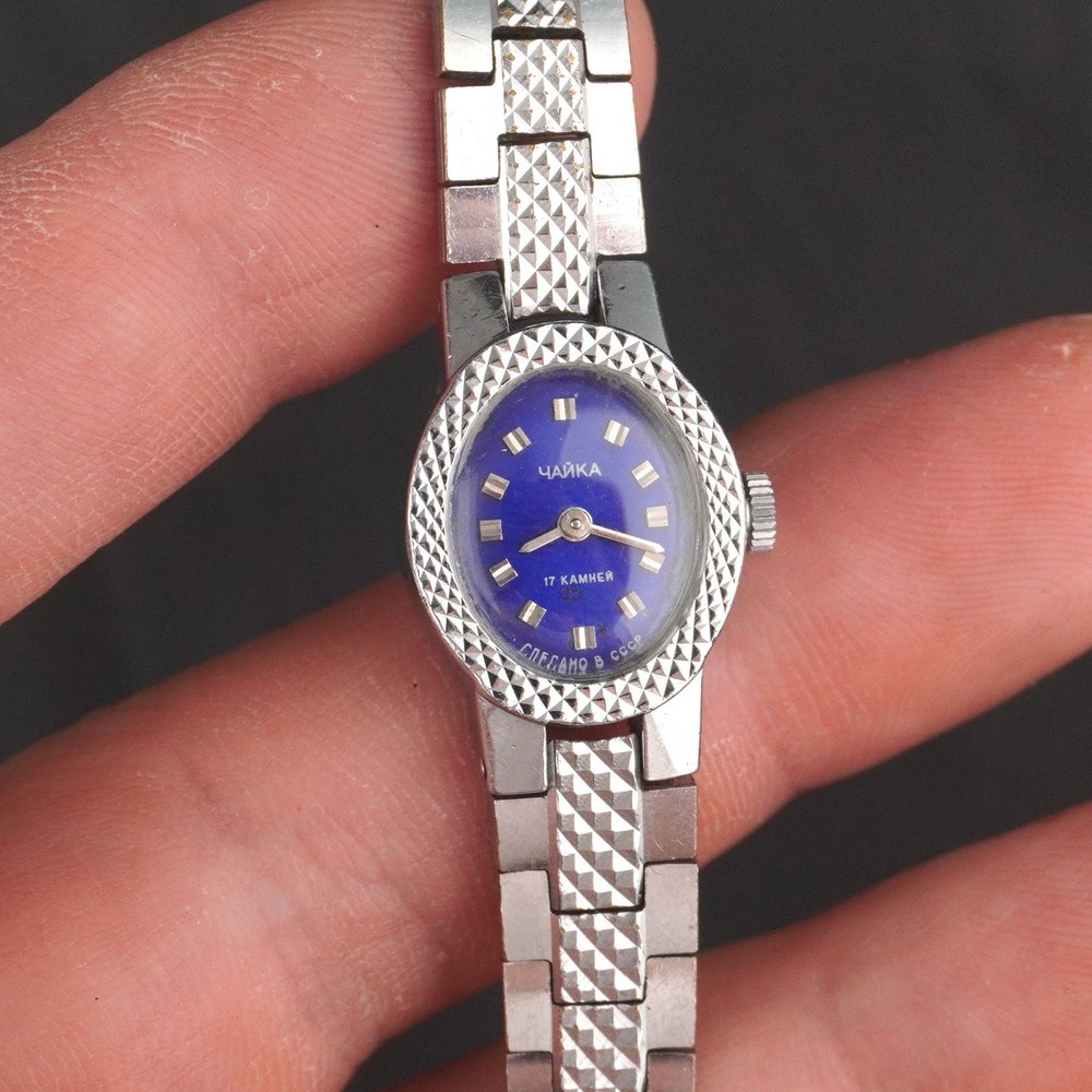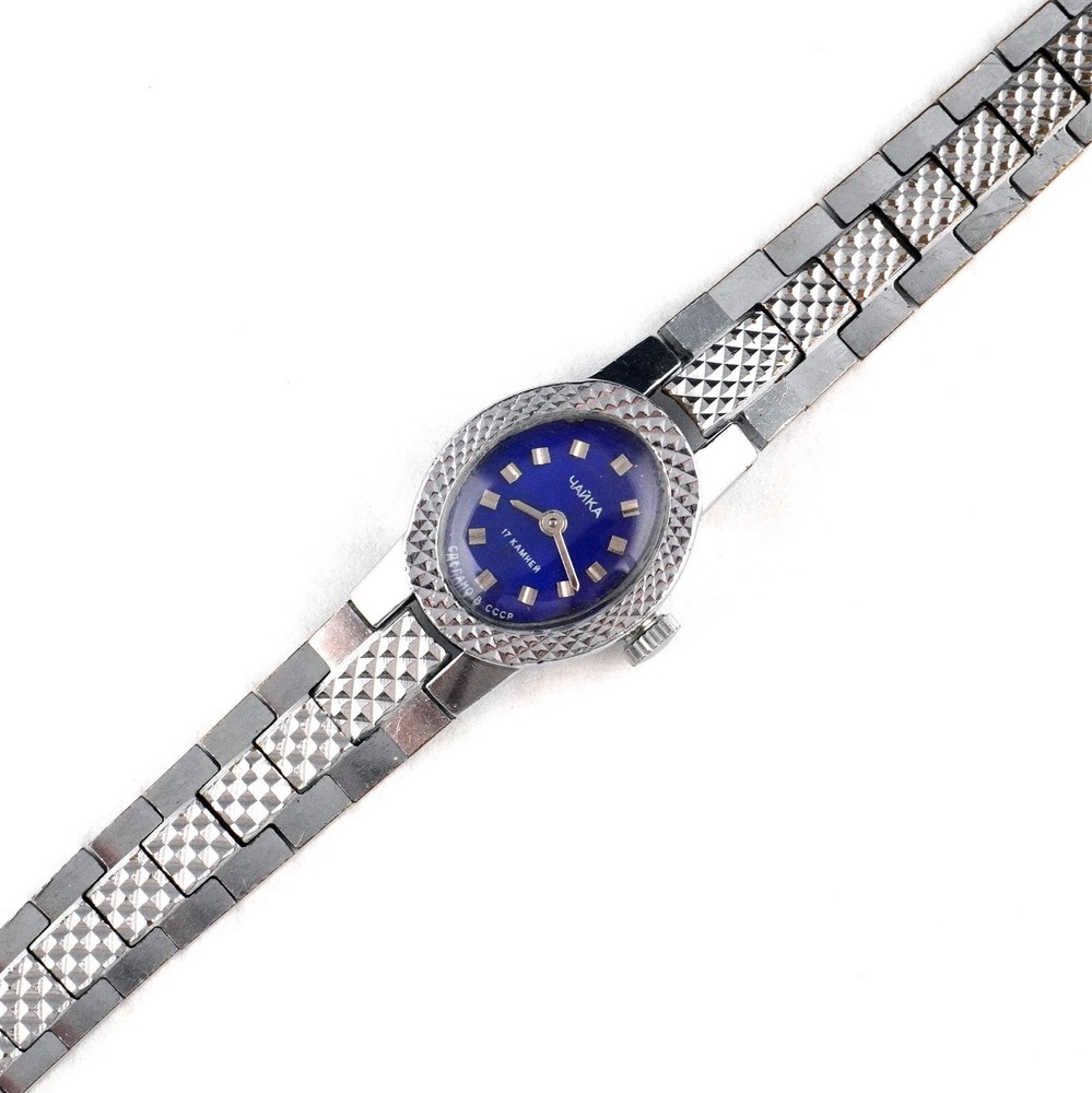 Elegant vintage Chaika ladies wristwatch from the Soviet Union, featuring a striking deep blue dial, silver-tone indices, and a beautifully textured bezel. This rare timepiece comes with its original patterned stainless steel bracelet, showcasing classic Soviet design. Recently serviced by a professional watchmaker and keeps excellent time. Details: • Brand: Chaika (Чайка) • Origin: USSR (Made in CCCP) • Movement: Mechanical (hand-winding), 17 jewels • Case Size: 18.4mm – 19.4mm (approx.) • Bracelet: Original stainless steel, approx. 6 inches (15 cm) • Condition: Fully working, serviced, minor vintage wear