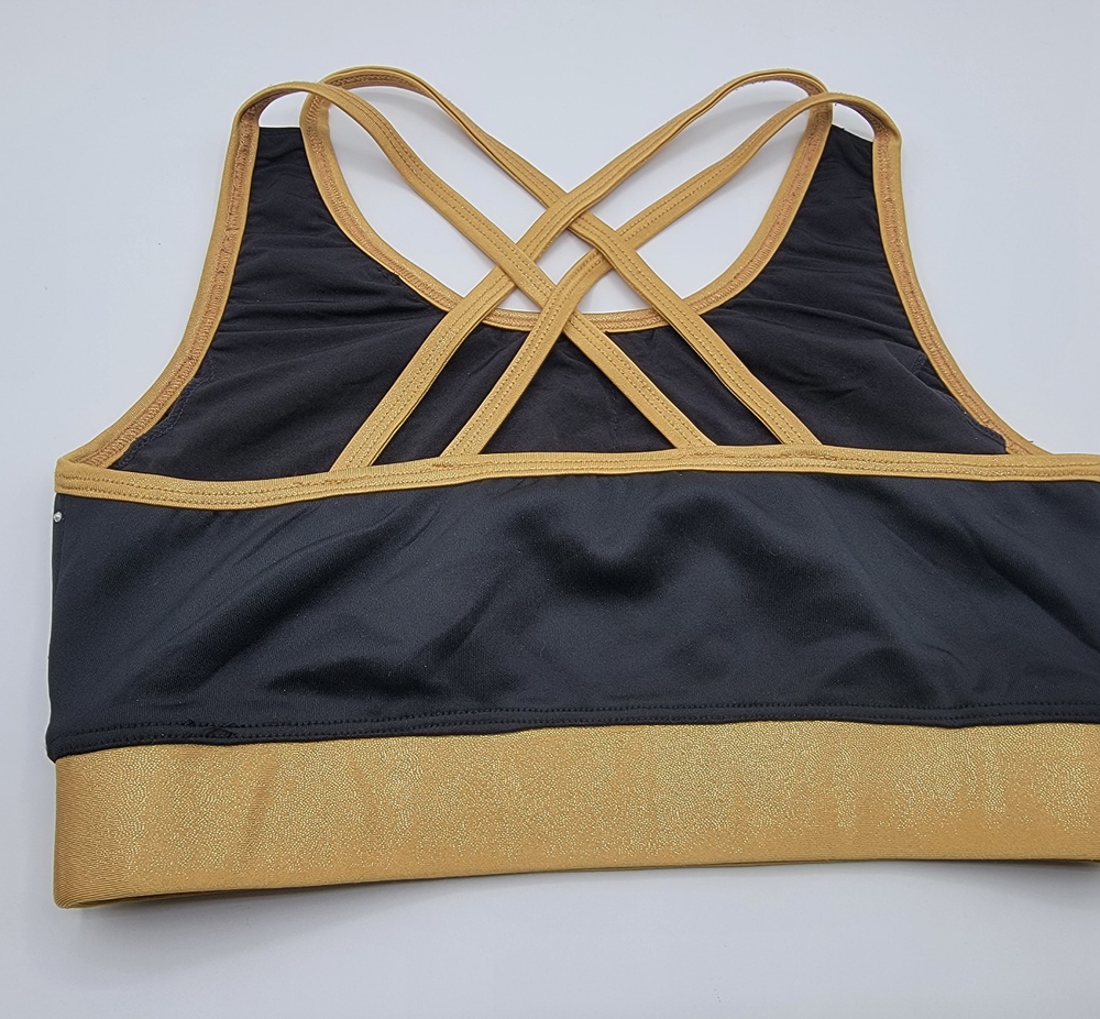 This RAD sports bra appears in excellent pre-owned condition. It appears to be missing 2 rhinestones. No other noted imperfections. CHAMPION CHEER women's cheerleading dance sports bra black gold rhinestone BLING!
