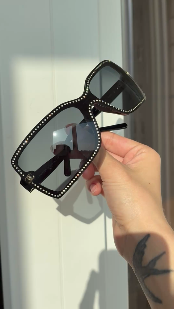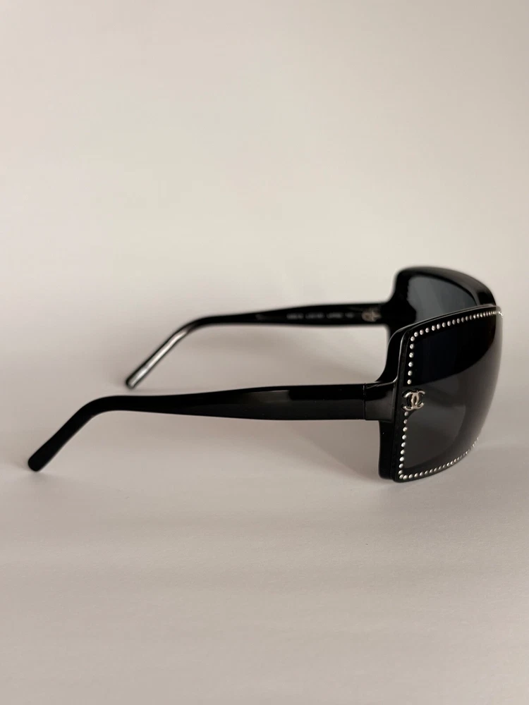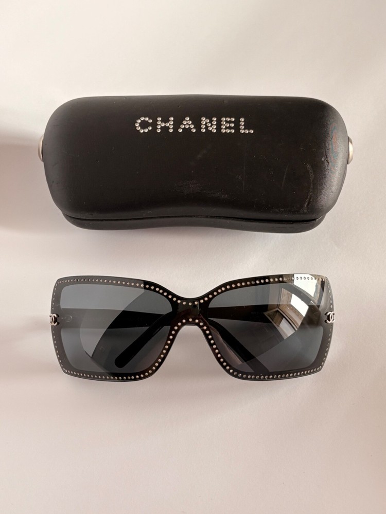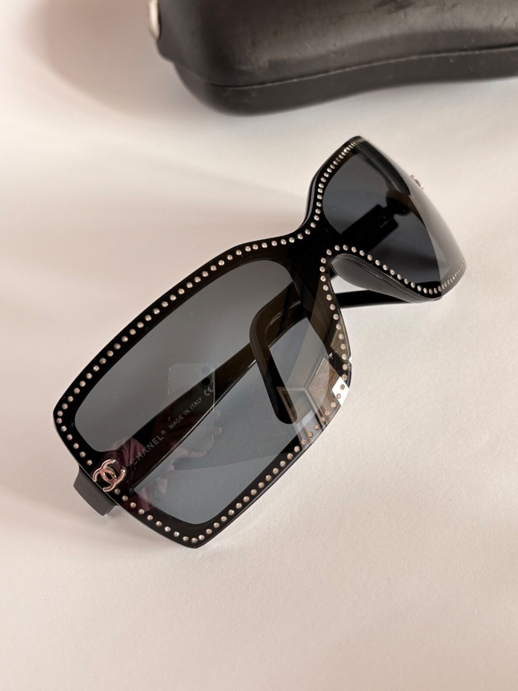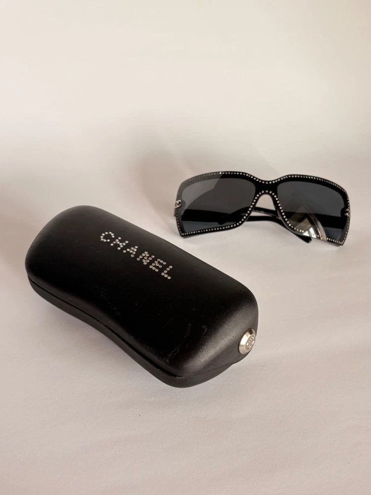 Chanel black sunglasses 5065-B c.501/87 LARGE 120 Swarovski crystals frame with small CC logos. Include case and dust bag. Condition: good, has scratches ( see photos) Open to your offers Check description and photos very attentively Add your phone number to the shipping info Worldwide delivery 7-25 days. No retuns. If your need any other information about postcage, measurements, photos etc. please contact me. I will be glad to help You!