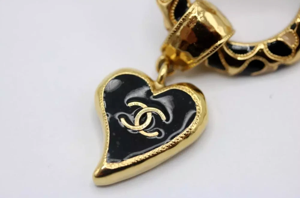 CHANEL 2022 Icon Goldtone Black/Beige Enamel Circle Dangling Heart Earrings Part of the Chanel 2022 spring summer collection. Features goldtone metal with black and beige enamel design. Earrings have a ring shape at the top with a dangling Heart on the bottom with CC logo. Black/Beige enamel Goldtone metal Ring has a 32mm diameter Earrings have a 2 inch drop Made in France Code: A22 P Should you have any further questions please feel free to e-mail. Thank you!