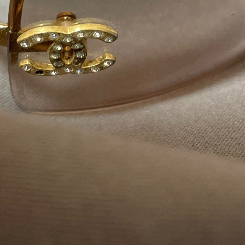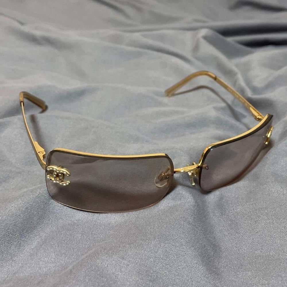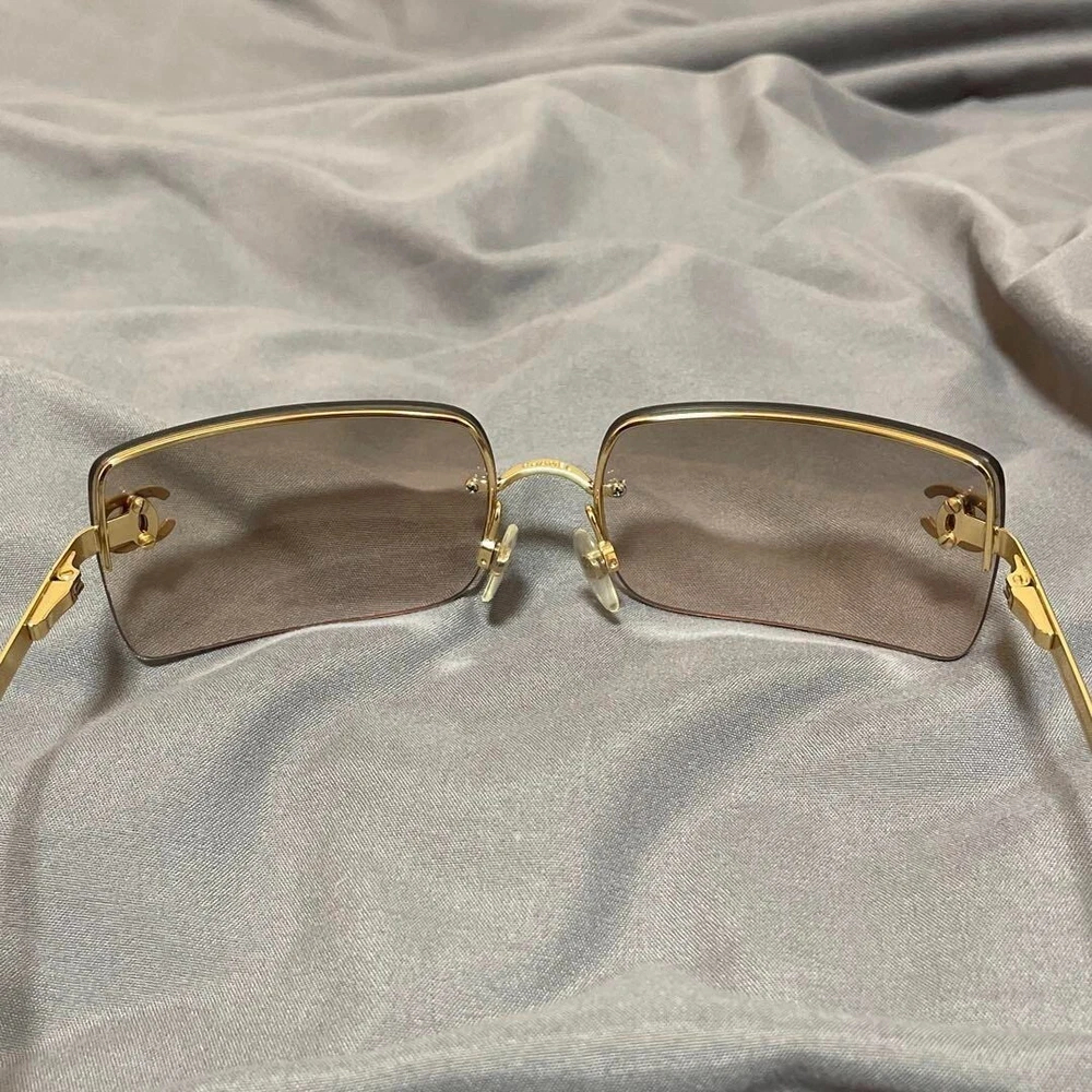 1. These CHANEL rimless sunglasses are a stylish vintage find with a sleek gold metal frame and iconic Coco Mark. Though pre-loved with minor wear—a missing rhinestone and light lens scuffs—they still exude luxury and timeless elegance. Perfect for adding a chic touch to any outfit while staying sun-safe. A great deal for designer eyewear lovers!