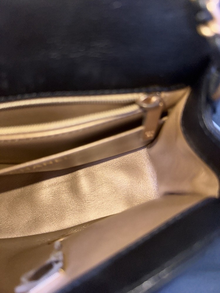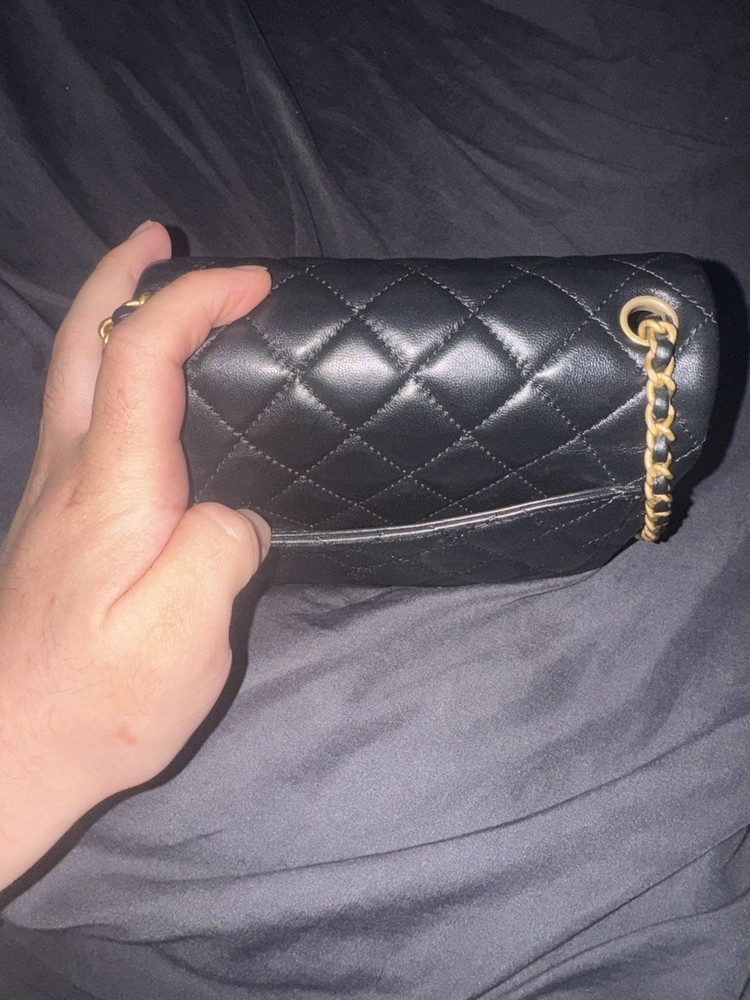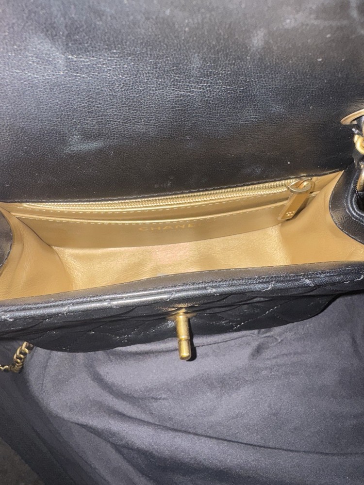 Exterior Color: Black Handle/Strap Color: Gold Lining Material: Lambskin Handmade: No Shape: Square Handle/Strap Material: Leather Closure: Turn Lock Style: Crossbody Hardware Color: Black Size: Mini Personalize: No Brand: CHANEL Department: Women Vintage: No Lining Color: Gold Exterior Material: Leather Finish: Quilted Accents: Pearl