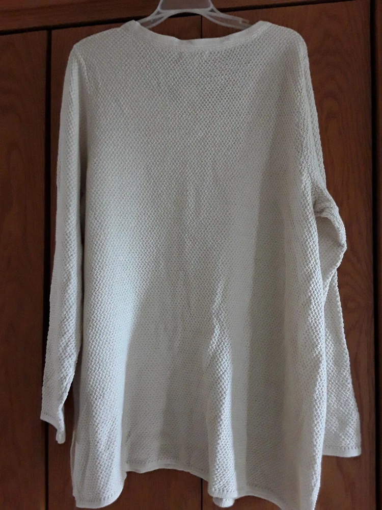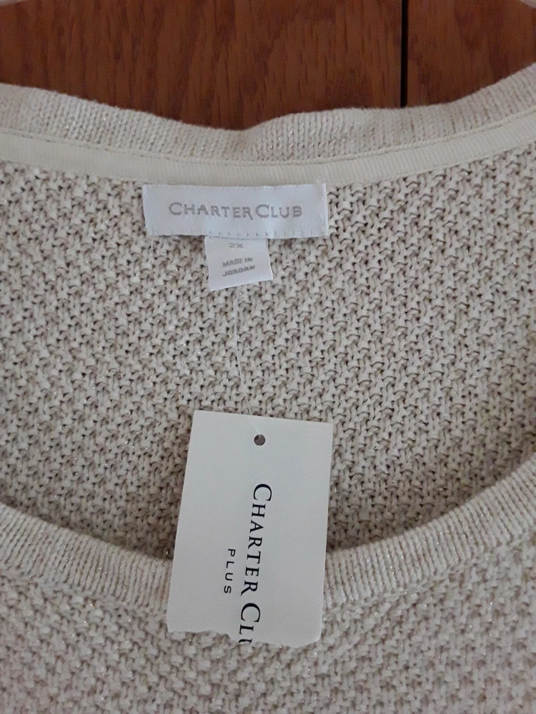 CHARTER CLUB 2X Ivory/Gold Cotton Blend Long Sleeve Scoop Neck Sweater NEW Armpit-armpit: 24" Sleeve Length 27" Length: 32" AT Combined Shipment: USA : Highest item shipping cost + $3.00. for each subsequent item.Or, you can purchase as many items as you choose and pay the flat rate of $ for your Priority Mail Large Flat Rate Box which covers your entire order. Please read the disclaimer below. INTERNATIONAL SHIPMENTS: Highest item shipping cost {+ Item weight.} for each subsequent item. Please read the disclaimer below. DISCLAIMER on Shipping Costs: Our intention is to keep our shipping costs as low as possible. However, depending on the item purchased (weight) and the destination, shipping rates can vary; especially 30 Day?s No Questions Asked Returns Policy: Your satisfaction is very important to us. We have a 30 days NO QUESTIONS ASKED returns policy. The item must be returned in the condition in which it was purchased. If there are labels/tags they should not be removed. If they are, the item will be sent back to you. ANY SHIPPING COSTS WILL NOT BE REFUNDED. BOTH WAYS, receiving and any returns. Please contact us for the return shipping address and authorization. ALL COMMUNICATIONS MUST BE IN WRITING & TAKE PLACE THROUGH THE EBAY SITE ONLY. No private direct email correspondence. A customer care rep. will respond to you within 24 hrs (Mon-Fri). Once we have received the merchandise and inspected it, please allow 72 hours for a refund to be issued. NO See my other listings for more great items! We accept PAYPAL. Also we have a virtual terminal with PayPal through which we can accept Visa, MasterCard, Amex, and Discover. If you do not have a PayPal account, it takes virtually minutes to open International shipments: PLEASE DO NOT PAY until we determine your shipping costs. Most of our items also have an International Flat-Rate. Although, if due to the destination or the weight we are unable to honor the rate mentioned in the item?s listing, we will cancel your order and leave you positive feedback. Usually we use the US Postal Service. The best international rate for an international shipment is First Class (up to 4 lbs.)If your items exceed 4 lbs. we may pack them into two separate packages (and notify you of this).You still are eligible to take advantage of the combined shipping rates, even if we have packed them into two separate packages. The fees for packaging, shipping, insurance, Customs Duty Charges on international shipments are all the responsibility of the Buyer and are not included in the purchase price. If the item(s) are gifts, we could indicate ?GIFT? on the customs form so you would avoid paying more on duty.