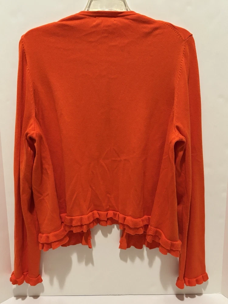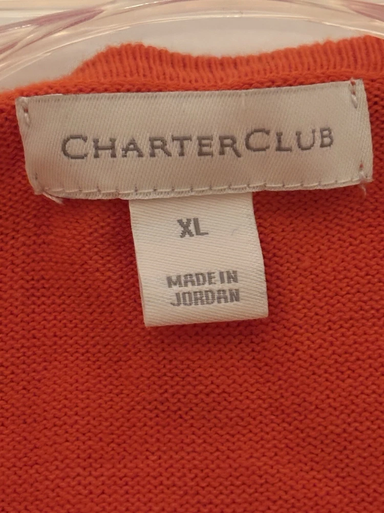 Elevate your wardrobe with the Charter Club tangerine open sweater, a versatile addition that brings a touch of feminine energy to your workwear or travel attire. Fashioned with a classic crew neck and long sleeves, this cardigan in size XL offers a regular fit for all-day comfort. Its tight-knit fabric, a soft blend of cotton and rayon, ensures both warmth and breathability.The sweater's design features a ruffled hem for a hint of flair and a button closure that adds a sophisticated touch. Machine washable for easy care, it's ideal for those who appreciate a preppy, yet effortless style. Whether layered over a blouse for the office or draped over a sweater for a fall outing, this piece is a timeless choice for any season. The sweater is preowned never used.