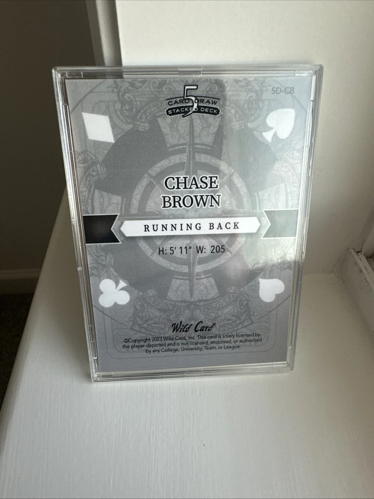 This is a unique and rare sports trading card featuring Chase Brown, a former Cincinnati Bengals player. The card is part of the 2023 Wild Card 5 Card Draw Stacked Deck set and is printed with a 1/1 rainbow foil. It has a king of clubs parallel/variety and features serial numbering, making it a valuable addition to any collection. The card is not autographed, but it does have a label or sticker autograph format. It is a must-have for any football fan and collector.