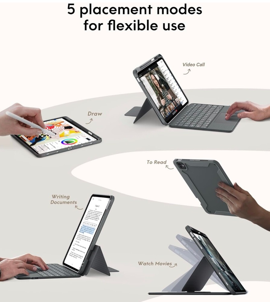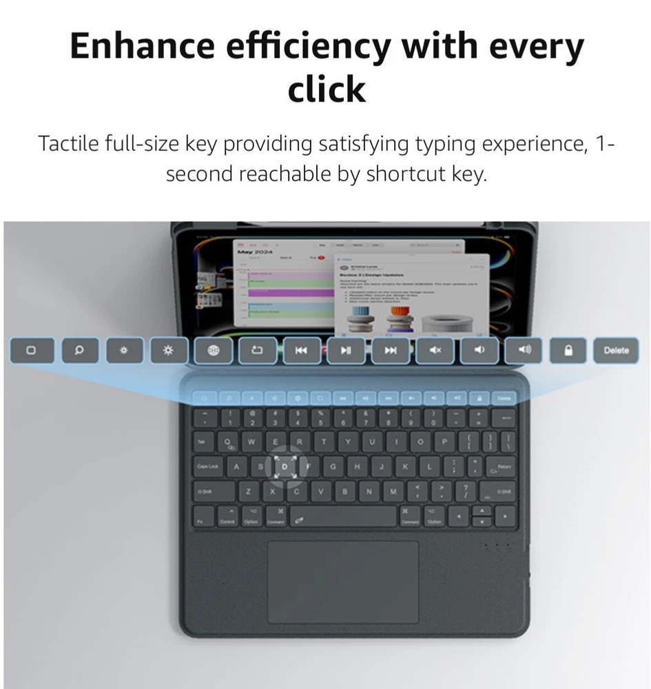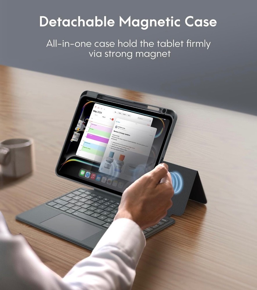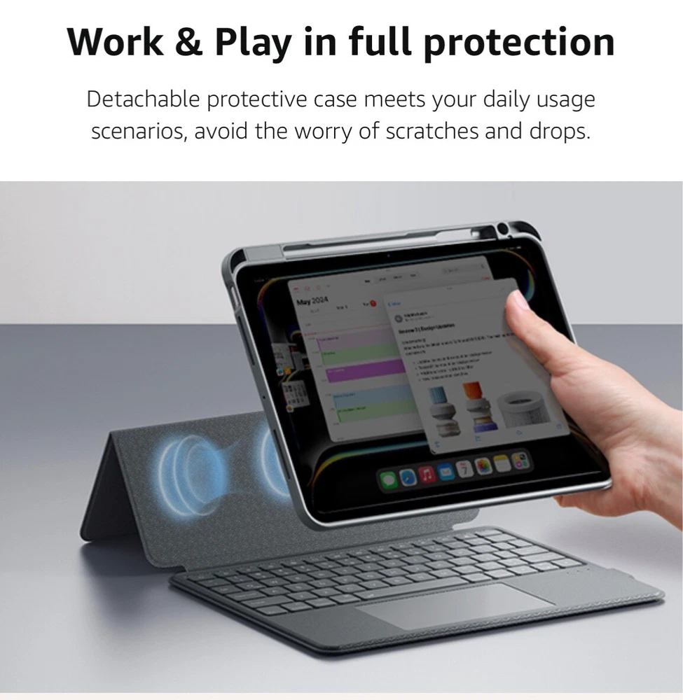 #1571 CHESONA Rugged for iPad Pro 11 (M4) 2024 Case with Keyboard, Magnetic Detachable Case & 7-Color Backlit, Smart Trackpad, 15°-180° Adjustable Stand, Portrait/Landscape, Gray Brand: CHESONA Compatible Devices: for iPad Pro 11 (M4) 2024 Connectivity Technology: Wireless Keyboard Description: Multi Functional Special Feature: Backlit Color: Gray 【 Compatibility 】 : This keyboard case is designed for iPad Pro 11-inch 2024. NOTE:NOT FIT FOR IPAD AIR 11(M2) 2024. 【 Magnetic Detachable Keyboard 】 : The intelligent keyboard case lets you switch between a lightweight laptop and your tablet.Ultra-strong magnets seamlessly integrate the case with your tablet, allowing you to remove it and change orientation if not needed. Precise cutouts allow easy access to all ports, camera, speakers, headphone jack and volume control. 【 Comprehensive Protection 】 : Premium hard-shell design protects all sides of tablet, and the included compatible camera case realizes 360° protection against accidental tablet drops, scratches and dust. Stunning pen slot design! The pencil holder prevents loss and won't get in the way of charging. Whether you're a student, writer, or professional, our keyboard case will meet your needs. 【 7-Colors Backlit & Shortcuts 】 : With 7 backlight colors and 3 levels of brightness, it's easy to use your tablet even in dark environments. Adjust the brightness to match your preferences, providing an excellent typing experience even in low light or at night. With a complete set of multimedia shortcuts, you can effortlessly control volume, and manage music playback, elevating the multimedia capabilities of your case with keyboard. 【 Precise Multi-touch Trackpad 】 : The case with keyboard for tablet includes a spacious multi-touch trackpad, delivering precise touch responses for editing, browsing and watching videos. Its larger trackpad allows for seamless navigation without an external mouse. Transform your tablet into a laptop-like, enhancing productivity and creativity. Ideal for business, school, and travel. 【 Battery & Support 】 : Built-in rechargeable battery extends battery life, working for over 50 hours on a full charge in 2-3 hours. If the keyboard does not work for 10 minutes, it will go into sleep mode and it will be disconnected from your tablet. When you press any key, it wakes up and connects to tablet again. What's in the box 1 x Pro 11(M4) Case (Tablet NOT included) 1 x Wireless Keyboard 1 x USB Charging Cable (No Charger) 1 x User Manual