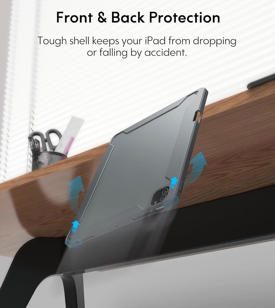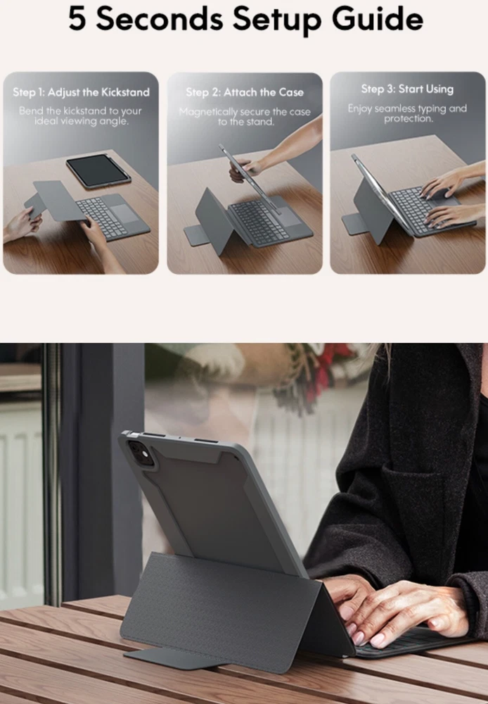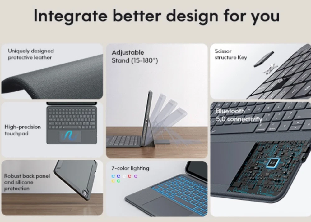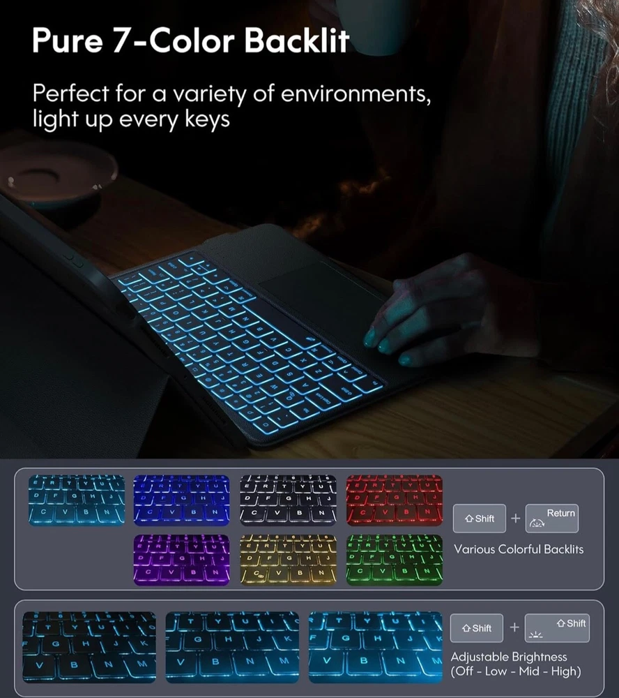 #1571 CHESONA Rugged for iPad Pro 11 (M4) 2024 Case with Keyboard, Magnetic Detachable Case & 7-Color Backlit, Smart Trackpad, 15°-180° Adjustable Stand, Portrait/Landscape, Gray Brand: CHESONA Compatible Devices: for iPad Pro 11 (M4) 2024 Connectivity Technology: Wireless Keyboard Description: Multi Functional Special Feature: Backlit Color: Gray 【 Compatibility 】 : This keyboard case is designed for iPad Pro 11-inch 2024. NOTE:NOT FIT FOR IPAD AIR 11(M2) 2024. 【 Magnetic Detachable Keyboard 】 : The intelligent keyboard case lets you switch between a lightweight laptop and your tablet.Ultra-strong magnets seamlessly integrate the case with your tablet, allowing you to remove it and change orientation if not needed. Precise cutouts allow easy access to all ports, camera, speakers, headphone jack and volume control. 【 Comprehensive Protection 】 : Premium hard-shell design protects all sides of tablet, and the included compatible camera case realizes 360° protection against accidental tablet drops, scratches and dust. Stunning pen slot design! The pencil holder prevents loss and won't get in the way of charging. Whether you're a student, writer, or professional, our keyboard case will meet your needs. 【 7-Colors Backlit & Shortcuts 】 : With 7 backlight colors and 3 levels of brightness, it's easy to use your tablet even in dark environments. Adjust the brightness to match your preferences, providing an excellent typing experience even in low light or at night. With a complete set of multimedia shortcuts, you can effortlessly control volume, and manage music playback, elevating the multimedia capabilities of your case with keyboard. 【 Precise Multi-touch Trackpad 】 : The case with keyboard for tablet includes a spacious multi-touch trackpad, delivering precise touch responses for editing, browsing and watching videos. Its larger trackpad allows for seamless navigation without an external mouse. Transform your tablet into a laptop-like, enhancing productivity and creativity. Ideal for business, school, and travel. 【 Battery & Support 】 : Built-in rechargeable battery extends battery life, working for over 50 hours on a full charge in 2-3 hours. If the keyboard does not work for 10 minutes, it will go into sleep mode and it will be disconnected from your tablet. When you press any key, it wakes up and connects to tablet again. What's in the box 1 x Pro 11(M4) Case (Tablet NOT included) 1 x Wireless Keyboard 1 x USB Charging Cable (No Charger) 1 x User Manual
