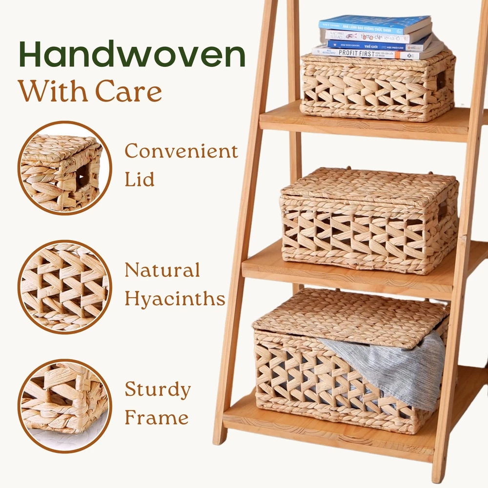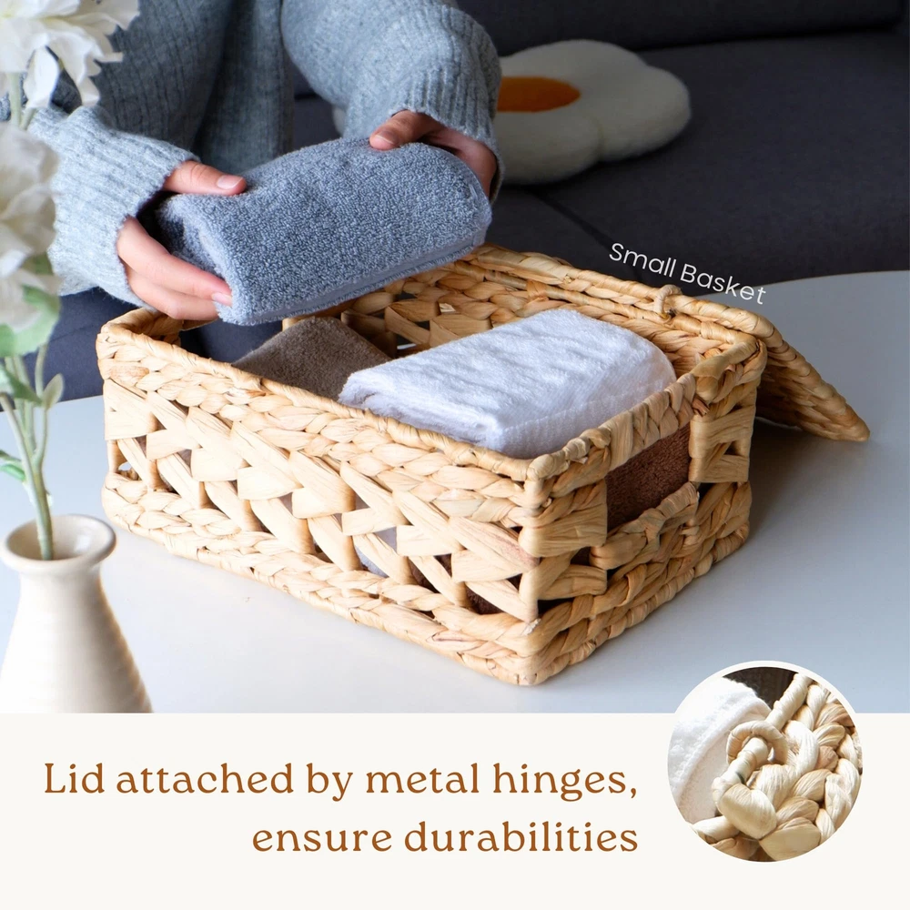 🌿 [𝐍𝐀𝐓𝐔𝐑𝐀𝐋 πŒπ€π“π„π‘πˆπ€π‹] Handwoven from water hyacinth, these lidded wicker baskets add a warm atmosphere to your home. Durable fibers and chemical-free, they will accompany your home for a long time! 🧑 [π”ππˆππ”π„ π€πππ„π€π‹πˆππ† 𝐏𝐀𝐓𝐓𝐄𝐑𝐍] Designed with a wavy open-weave pattern, these woven baskets are an irresistible item to mix and match with your furniture. Its appearance is suitable for many home decor styles, from rustic to bohemian. πŸ“¦ [π’π“π”π‘πƒπ˜ π…π‘π€πŒπ„π’] Our wicker baskets with lids are woven around a sturdy metal wireframe that reinforce their structure under any weight. Not only do they add a touch of style to your home, their flexible strands with steel frame can reliably withstand everyday use. Store up to 12 pounds in the large-size basket! 🎯 [πŒπ”π‹π“πˆππ‹π„ ππ”π‘ππŽπ’π„π’] These versatile baskets serve multiple purposes, including closet organization, toy storage 🧸, bathroom tidying 🧻, pantry organization 🍿, book & magazine storage πŸ“–, under-bed storage, and more. 🧰 [ππ”πˆπ‹π“-𝐈𝐍 𝐇𝐀𝐍𝐃𝐋𝐄𝐒] With our built-in handles, you can easily move these baskets everywhere in your home. The handles are specially crafted by water hyacinth which is softer than other natural material to make sure that there is no splinter that can piercing your skin. βœ… [ππŽπ“π„] Each square hyacinth basket is handcrafted, which may result in slight variations in shape, size, and color. This set includes three sizes: L14" x W11" x H7", L12.5" x W9" x H6", and L11" x W8" x H5". Suitable for indoor use only; All new wicker storage baskets have a particular natural smell of fibers that gradually disappears.