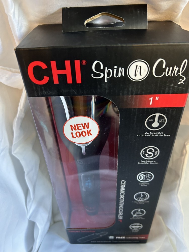 CHI Spin N Curl Ceramic Rotating 1" Hair Curler - Black Professional-Grade Styling Tool with Advanced Ceramic Technology This CHI Spin N Curl features a 1-inch ceramic barrel with automatic rotation functionality for effortless curl creation. The ceramic heating element provides even heat distribution and ionic technology to reduce frizz while maintaining hair's natural moisture balance. Key Specifications: 1-inch ceramic barrel diameter Automatic bi-directional rotation mechanism Multiple heat settings with digital temperature control Ceramic coating for consistent heat transfer Built-in safety features including auto-shutoff Professional-length swivel cord Color: Black Condition: New In Box What's Included: Original box and curling iron, unopened The ceramic construction ensures optimal heat retention and distribution, while the rotating mechanism eliminates the guesswork in curl direction. Suitable for all hair types and lengths that accommodate the 1-inch barrel size.