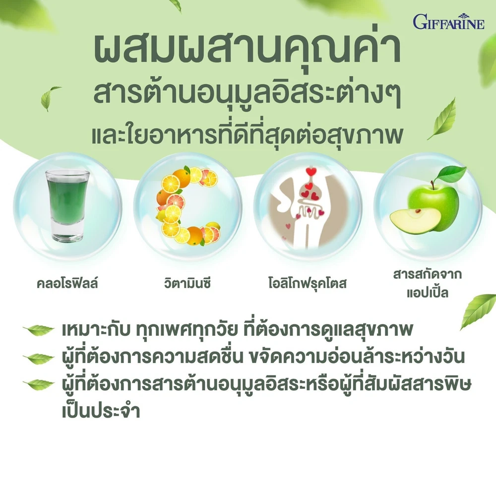 Chlorophyll Diet Slim Weight Control Fiber Detox No Sugar Good Health Skin Care . CONDITION : New BRAND : Giffarine TYPE : Supplement for Healthy SIZE : 1 pack = 30 Sachets (1 sachet = 1 g) NOTIFICATION NUMBER : 13-1-03440-1-0077 . Packed with benefits from powerful ingredients that help fight free radicals, detoxify the body, boost immunity, control harmful bacteria, stimulate the digestive system, enhance calcium absorption, and reduce unpleasant body odors. Backed by various research studies, chlorophyll has been shown to inhibit several types of carcinogens. Combined with apple extract and vitamin C, it also helps reduce inflammation, slow down aging, and stimulate collagen production. . Simply mix "Giffarine C-O Chlorophyll" with 1.5 liters of water and refrigerate for a refreshing drink throughout the day. It helps nourish your body from within, keeping you energized and ready for any activity. Perfect for everyone in the family, especially those who want to maintain good health, glowing skin, a healthy digestive system, and smooth bowel movements—or those dealing with unwanted body or bad breath odors. . DIRECTIONS : Take 1 sachet (1 gram) daily mixed with 1.5 liters of water. Can be eaten all day long. For best quality, it should be consumed within 1 day . FDA Registration Number : 13-1-03440-1-0077 Packaging Size : 1 pack = 30 Sachets (1 sachet = 1 g) Net Wt. : 60 g. . About Giffarine : Giffarine is a trusted brand renowned for its commitment to quality in health and dietary supplements. We prioritize natural ingredients and rigorous quality control processes to ensure safety and effectiveness in all our products. . SHIPPING & HANDLING : - Shipping via Air Mail package. - Product will be shipped from Thailand with Tracking Number - The buyer is responsible for paying import taxes. - Item will be shipped within 1-2 business days after received your payment. - Delivery Time America 2-4 Weeks . RETURN & CLAIM : After receiving an item. If you are unsatisfied you can return the item for a full refund within 30 days. The item must be returned in original condition. . Thank you very much for your purchasing. . Welcome to my store every times. Siam910-4289