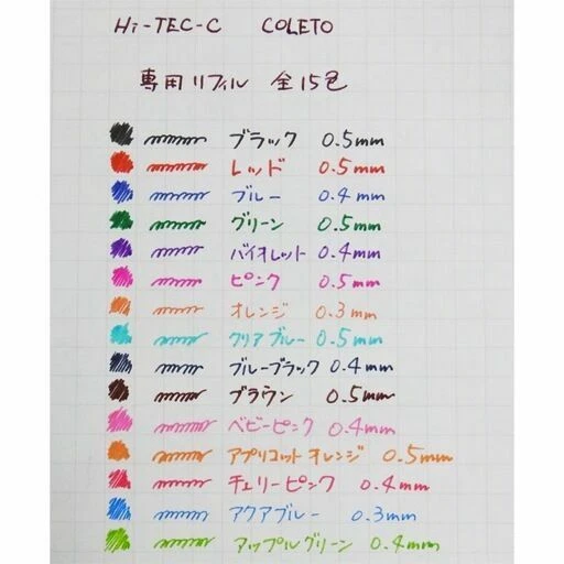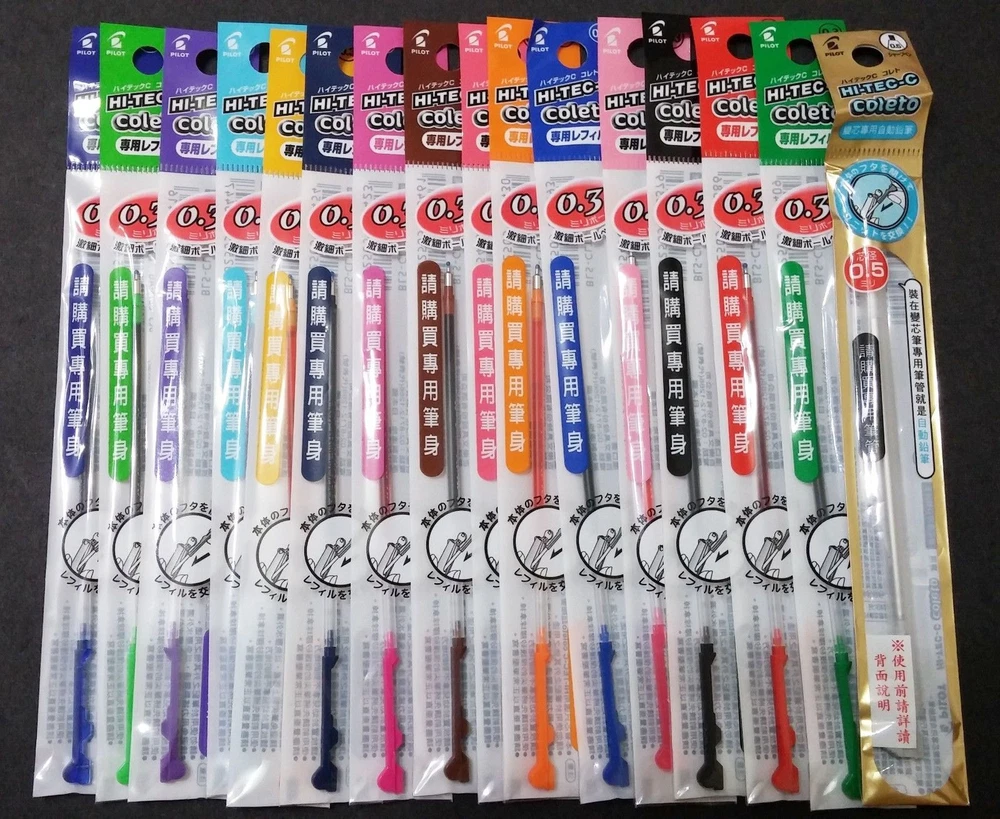 CHOOSE ANY 5x HI-TEC-C Coleto Refills 15 beautiful colors to choose from! This listing doens't come with any pens! Please see our store for all the pens available - dozens of varieties! Search our store for "coleto" - see the red store icon next to our feedback score (top right of screen) 3 different sizes to choose from : 0.3mm, 0.4mm, 0.5mm Refill co lours: Black, Blue Black , Blue, Aqua Blue, Clear Blue, Green, Apple Green, Orange, Apricot Orange, Violet, Pink, Baby Pink, Cherry Pink, Red, Brown PLEASE LEAVE A NOTE OR SEND US A MESSAGE OF THE COLORS AND SIZE YOU NEED! Value Set! If you have any special request, just send me a message! Please check our other items when shopping! Airmail delivery from Taiwan to Worldwide For delivery estimate to your country, please see below.