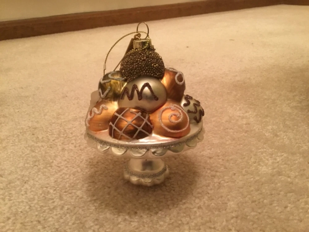 YOU ARE GETTING 3 OF KATHERINES GORGEOUS GINGERBREAD CHOCOLATE CANDIES OR BONBON PLATTER. THEY ARE ABOUT 4 1/2 IN Hgh X 4CIN WIDE. SO DETAILED WITH ALL THE GLITTER AND BEADING ON THESE PEDESTAL PLATES OF CHOCOLATES ON THESE HAND BLOWN ORNAMENTS. ADDITIONAL SHIPPING TO ALASKA OR HAWAII. PLEASE SEE MY LISTINGS FOR OTHER UNIQUE ITEMS AND MORE ORNAMENTS. YOU ARE GETTING THIS IS ABOUT HALF OF WHAT THE COST WOULD BE FOR KATHERINES COLLECTIONS.