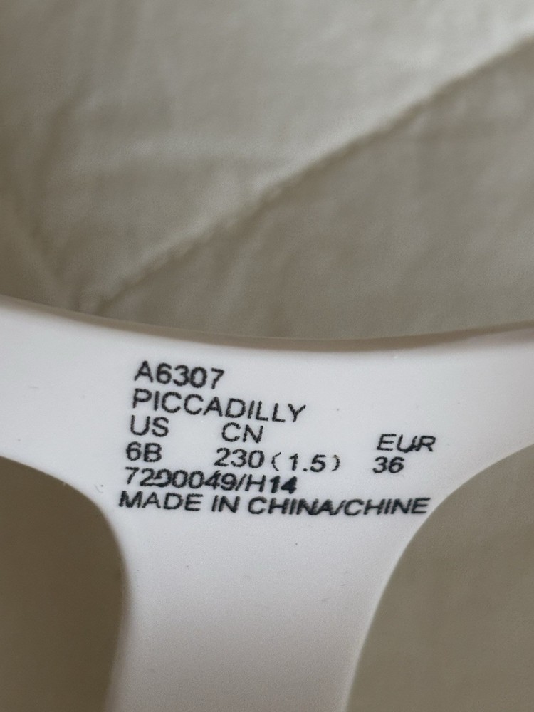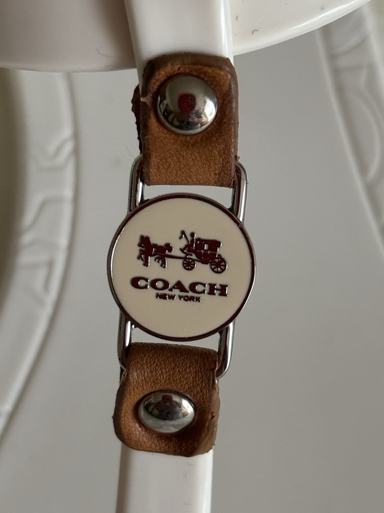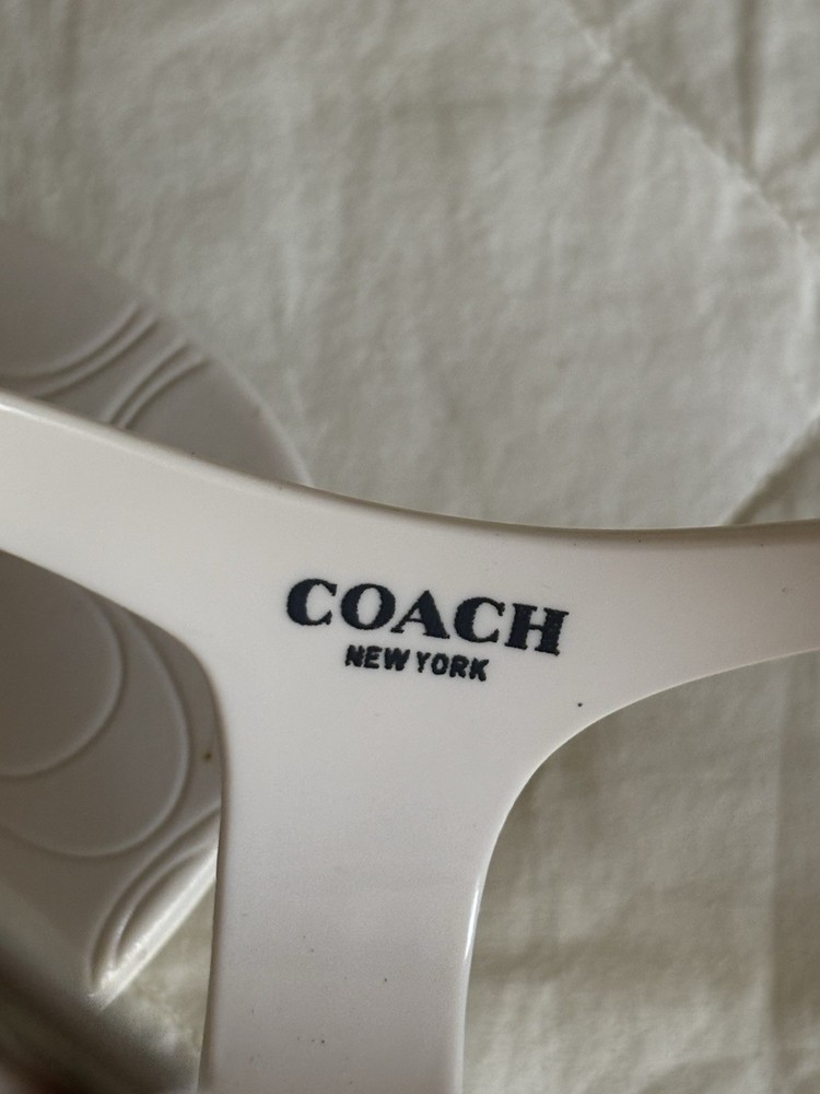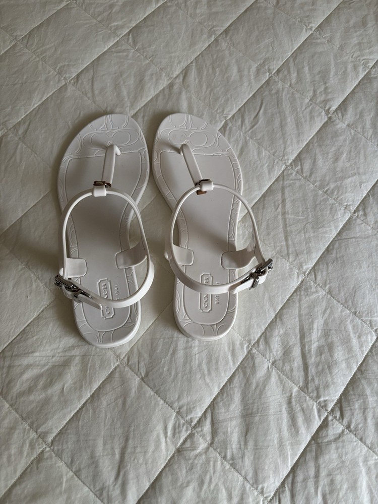 The COACH Piccadilly A6307 White T-strap Jelly Sandals in Women's Size 6B are a stylish and comfortable choice for warm weather. Featuring a flat sole and ankle strap design, these sandals are perfect for summer and spring outings. Made with PVC upper material, they are easy to clean and maintain, making them a convenient option for any casual outfit. With the iconic Coach branding and classic white color, these sandals are both fashionable and practical for everyday wear. They come from a smoke free/pet free home.