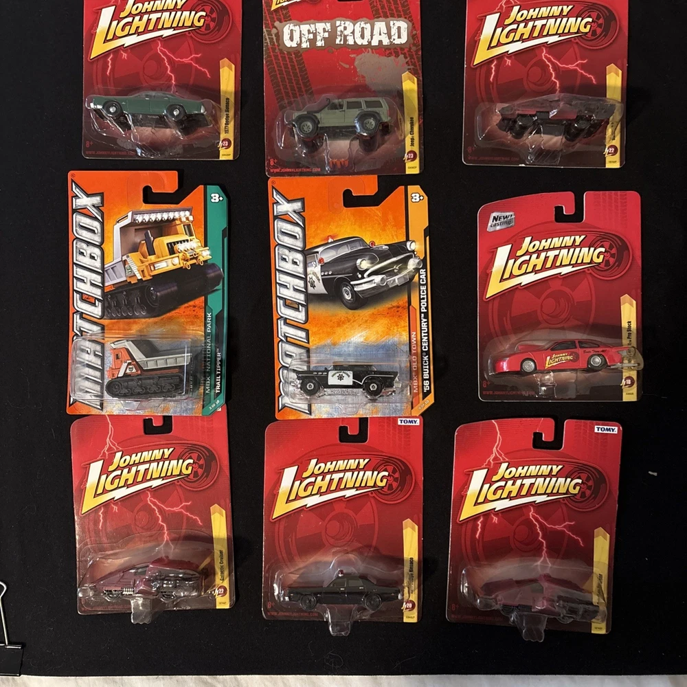 The product is a lot of 9 total coming with 7 Johnny Lightning & 2 MATCHBOX toy cars in 1/64 size, featuring the Jeep Cherokee, Dodge Monaco, Chevy Cobalt Pro Stock, Galactic Cruiser, and for the matchbox is a 56 Buick Century Police car and a MBX National Park Trail Ripper. These diecast cars are part of the Tommy series by Johnny Lightning, known for their detailed designs and vibrant red color. Perfect for collectors or vintage toy car enthusiasts, this lot offers a unique and nostalgic addition to any collection.