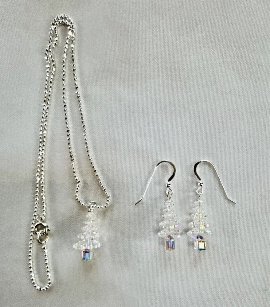 SET OF CHRISTMAS TREE EARRINGS AND NECKLACE Each new tree dangle in earrings and necklace consist of 6 pieces Swarovski Crystals in Crystal AB beads. The tree is made with 6mm, 8mm, 10mm and 12mm marguerite Swarovski Crystal beads. The tree is topped with a 4mm crystal AB bicone. The base is a 4mm crystal AB cube. The earrings are attached to Sterling Silver french earwires. The entire length of each earring is about 1.5 inches. The necklace is on a silver colored ball chain and is about 18" long. These can be made with Gold-filled headpins and ear wires. FREE SHIPPING AND HANDLING ON THIS ITEM!!! Visit my store for matching Swarovski Crystal bracelets and other Sterling Silver jewelry. I also carry Swarovski Crystal loose beads in 4mm, 5mm, 6mm, 8mm and 10mm sizes and multiple colors and mixes.