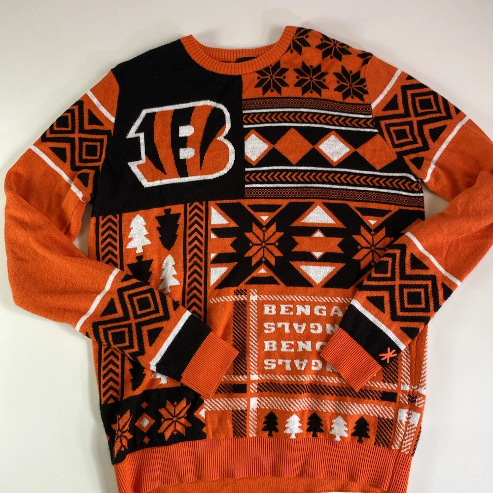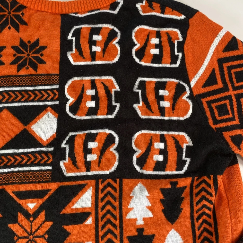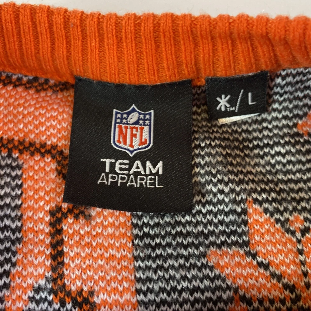 Show off your love for the Cincinnati Bengals with this officially licensed NFL Team Apparel sweater. Perfect for the holiday season, this unisex adult sweater features the team's iconic orange color and is available in size large. The sweater is made for football fans and carries the team's logo prominently on the front, making it a must-have for any fan. Celebrate Christmas in style with this comfortable and stylish sweater. It is perfect for both adults and teens and is a great addition to any sports fan's wardrobe. Get ready to cheer on your favorite team in the National Football League (NFL) and show off your love for the Cincinnati Bengals with this awesome sweater.