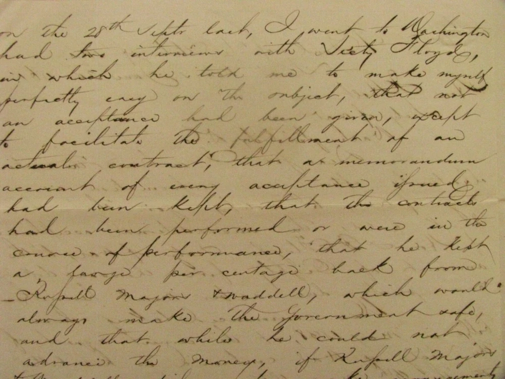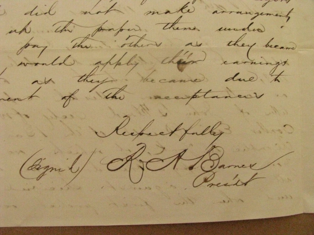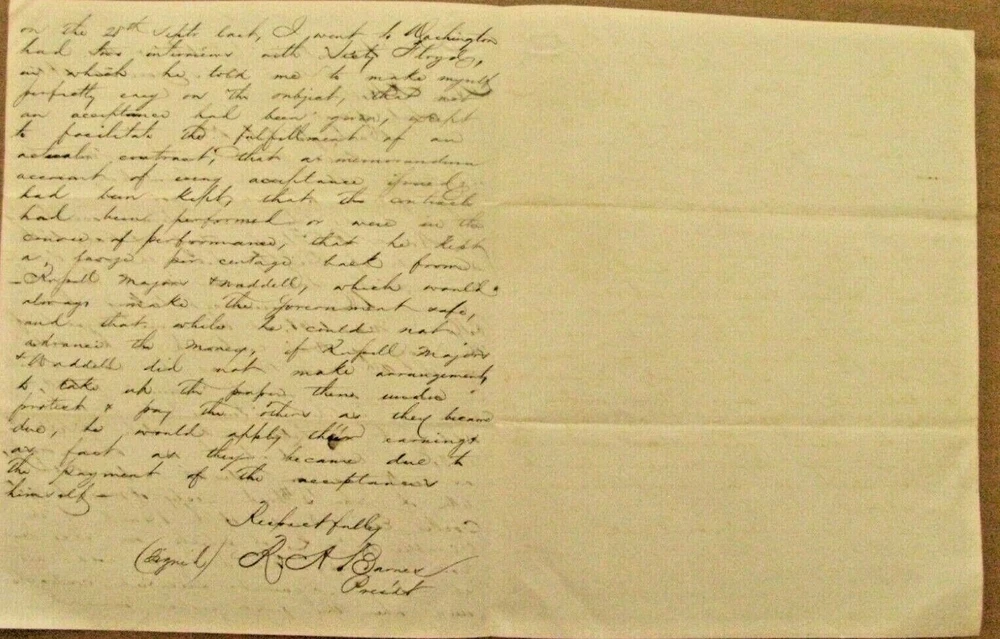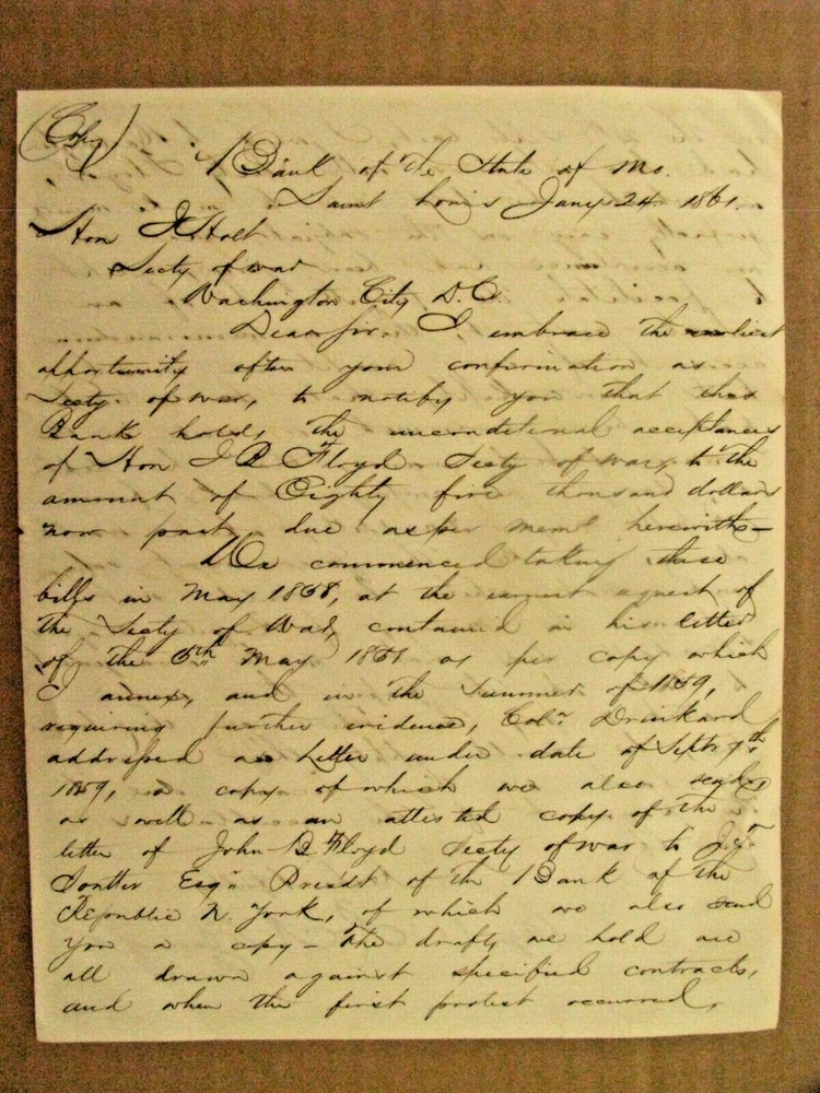 General John Floyd was US Secretary of war in the 1850s during the Utah Expedition or Mormon war. He renounced his offices in 1861 to go with the South on the start of the Civil War but left under a cloud as he was under investigation for embezzlement of huge sums of money from War Department contracts made by the government to supply the Army posts on the western frontier during the Mormon War. An original 1861 Bank Copy Letter dated January 24, 1861 Letter from the Bank of the State of Missouri, St Louis, to Secretary of War J.C Holt at Washington, DC, seeking to collect $85,000 due the bank , through loans beginning in May, 1858 in contracts via Colonel Drinkard (William R Drinkard, Acting Secretary of War after Floyd's resignation) and JF Southern Bank of New York , for drafts drawn on contracts , and as the writer had travelled to Washington and was personally assure d by Secretary of War Floyd that the contracts had been filled with exception of moneys for Russell, Majors & Waddell, assures that money on the latter's contracts would be paid forthwith, with money due to be paid directly by the Secretary himself, This 2 pp 8 x 11" ink "Copy" letter is signed by R.A. Barnes as Bank President. Floyd was never tried for these accusations as the contracts were is such disarray when he departed his office that a paper trail could not be established. .Russell Majors and Waddell were the famous western wagon freight Company that created the Pony Express and went bankrupt in 1861, in large part due to the inability of the War Department to sort out the paperwork disarray left by Floyd. I got this with a group of Russell Majors & Waddell Company contract copy letters from an estate of the descendants. Edge wear, minor stains, Overall condition VG. Welcome to my Ebay Auctions and Ebay Store. I am a specialist in early American Military & Historical items, especially American Civil War ephemera- letters, military & historic documents including broadsides, commissions, General Orders and other imprints and badges. I have been collecting and selling original American Civil War & US Military memorabilia for 41 years My customers have included some of the leading names in collecting and selling American History items, as well was as a wide range of novice & advanced collectors in addition to some 30 US federal, state, public and private university & municipal museums and libraries. All items are unconditionally guaranteed to be authentic and in the condition as described. I am a longtime member of the Company of Military Historians, the New England Antique Arms Association, the Ephemera Society of America & the Civil War Veterans Historical Assn. NOTE: Any repair to a paper item is listed. I use only museum curator approved archival repair tape. I SELL ONLY ORIGINAL ITEMS, AND HAVE BEEN A PROFESSIONAL FULL TIME SELLER OF ANTIQUE HISTORICAL ITEMS SINCE 1980. PLEASE SEE MY EBAY STORE FOR OTHER LISTINGS. PLEASE READ DETAILS OF THE ITEM DESCRIPTION. I TRY TO DESCRIBE ALL ITEMS ACCURATELY U.S. SHIPPING ONLY