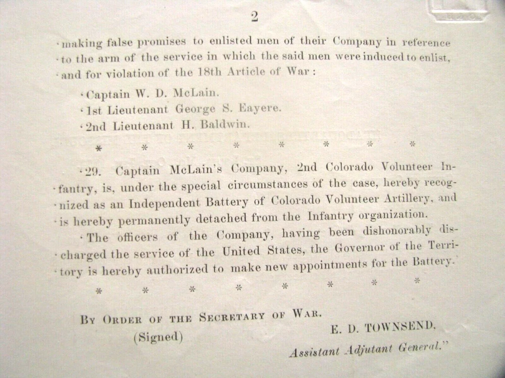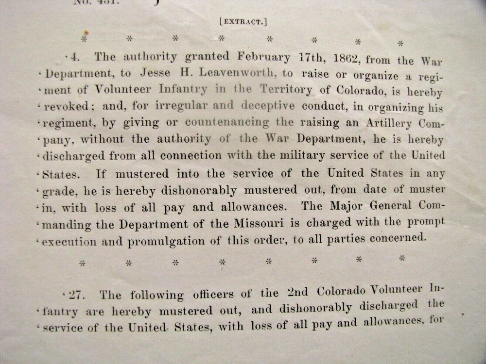 Colonel Jesse Henry Leavenworth, West Point Class of 1830 served w the 4th US Infantry protecting the first emigrants; his unit was known as the "Rocky Mountain Rangers" and was notable for it's Frontier Service. He re-enlisted when the Civil War erupted raising a the 2nd Colorado Volunteer Infantry, protecting Denver, and by 1863 was in charge of protecting the entire Santa Fe Trail. . An Original Civil War General Order issued at HQ Dept of the Missouri, St Louis, Oct 7, 1863 announcing the War Department has dismissed Leavenworth and 3 fellow officers for also raising an artillery battery without their consent, citing "deceptive practices" Despite the brouhaha created in Washington, Comes w service info- Leavenworth and his officers are re-instated, with Leavenworth in command of the 2nd Colorado, and the next year, recognizing his intimate knowledge of the Indians he grew up with (Jesse Chisholm considered him the man who maintained the peace with the Indians) , makes him Indian Agent for the Southern Cheyenne, Comanche & Kiowa. His subordinate officers incl Captain Wm McLain are restored to command the gun battery they had created, which served as McLains Independent Colorado Artillery Battery. 2p 8 x 5". Age stains, left edge torn, not affecting text., Overall VG. Comes w bio info. General & Special Orders were issued to communicate commands and information to the Army. Each order, issued in writing by a command, was then printed for distribution to each unit, either at an army department headquarter or by commanders at local headquarters, sometimes in the field on portable printing presses. The orders were then issued to regiments, often to be read aloud to the troops. General Orders were printed as issued with date & location; at the end of a year the regimental adjutant might retain them loose or simply string bind them by punching holes and stringing on ¼” red cloth string tape (the source of the old expression "government red tape"). Sometimes an officer or HQ clerk might take a group of orders to a local print shop or bookbinder and have an accumulation bound with leather or cloth covers. Usually, American Military Orders of the 19 th century including Civil War era were printed on an 8 x 5” sheet of quality rag paper. Welcome to my Ebay Auctions and Ebay Store. I am a specialist in early American Military & Historical items, especially American Civil War ephemera- letters, military & historic documents including broadsides, commissions, General Orders and other imprints and badges. I have been collecting and selling original American Civil War & US Military memorabilia for 41 years. PLEASE SEE MY EBAY STORE FOR OTHER CIVIL WAR AND EARLY AMERICAN MILITARIA LISTINGS. I am a longtime member of the Company of Military Historians, the New England Antique Arms Association, the Ephemera Society of America & the Civil War Veterans Historical Assn. My customers have included some of the leading names in collecting and selling American History items, as well was as a wide range of novice & advanced collectors in addition to some 30 US federal, state, public and private university & municipal museums and libraries. NOTE: Any repair to a paper item is listed. I use only museum curator approved archival repair tape. All items are unconditionally guaranteed to be authentic and in the condition as described. . I ship only USPS priority mail with insurance