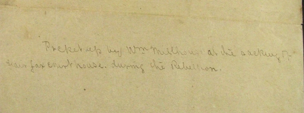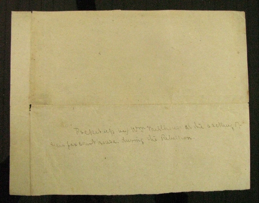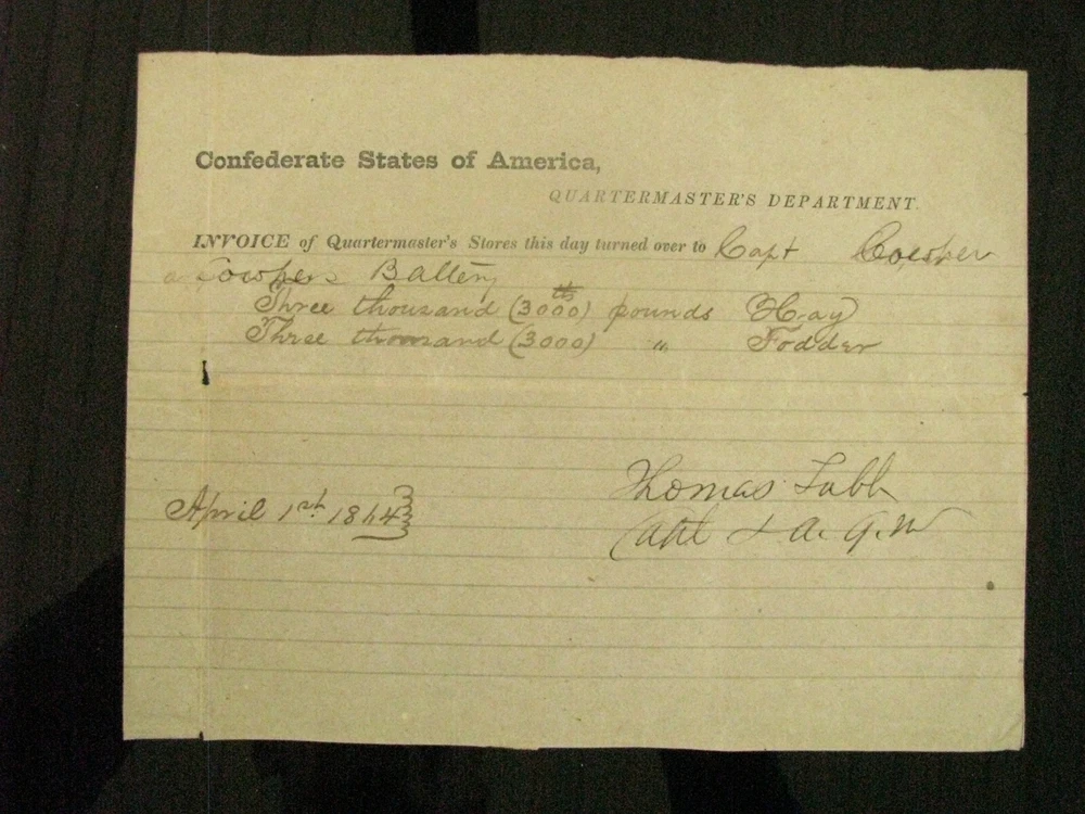 An original souvenir of the looting of Fairfax Courthouse, Virginia- a Confederate States of America Invoice for forage for Cooper's Battery , dated April 1st, 1864 and signed by Captain Thomas Tabb as AQM. The 1p 8 x 6" Invoice on brown Confederate paper has an ink inscription on the reverse" Picked up by Wm. Millhouse at the sacking of Fairfax Courthouse during the Rebellion". Comes w service info. Confederate Captain Thomas Tabb served with thw 3rd Virginia Infantry.. The person who picked up the Invoice, William Millhouse could have been one of 3 Union soldiers with that name. One was a member of the 49th Pennsylvania Infantry who was killed a month later at Spottsylvania Court House. The Invoice has folds and a small tear at one fold but is Overall VG with minor edge wear and age stains. Welcome to my Ebay Store. I am a specialist in early American Military & Historical items, especially American Civil War ephemera- letters, military & historic documents including broadsides, commissions, General Orders and other imprints and badges. I have been collecting and selling original American Civil War & US Military memorabilia for 41 years. PLEASE SEE MY EBAY STORE FOR OTHER CIVIL WAR AND EARLY AMERICAN MILITARIA LISTINGS. I am a longtime member of the Company of Military Historians, the New England Antique Arms Association, the Ephemera Society of America & the Civil War Veterans Historical Assn. My customers have included some of the leading names in collecting and selling American History items, as well was as a wide range of novice & advanced collectors in addition to some 30 US federal, state, public and private university & municipal museums and libraries. NOTE: Any repair to a paper item is listed. I use only museum curator approved archival repair tape. All items are unconditionally guaranteed to be authentic and in the condition as described. If you would like to Add Me as a Seller You Follow, please go to the Seller Information Bar on the Middle Right Side of the Page and click ‘Follow This Seller” I ship only USPS priority mail with insurance Mike Brackin