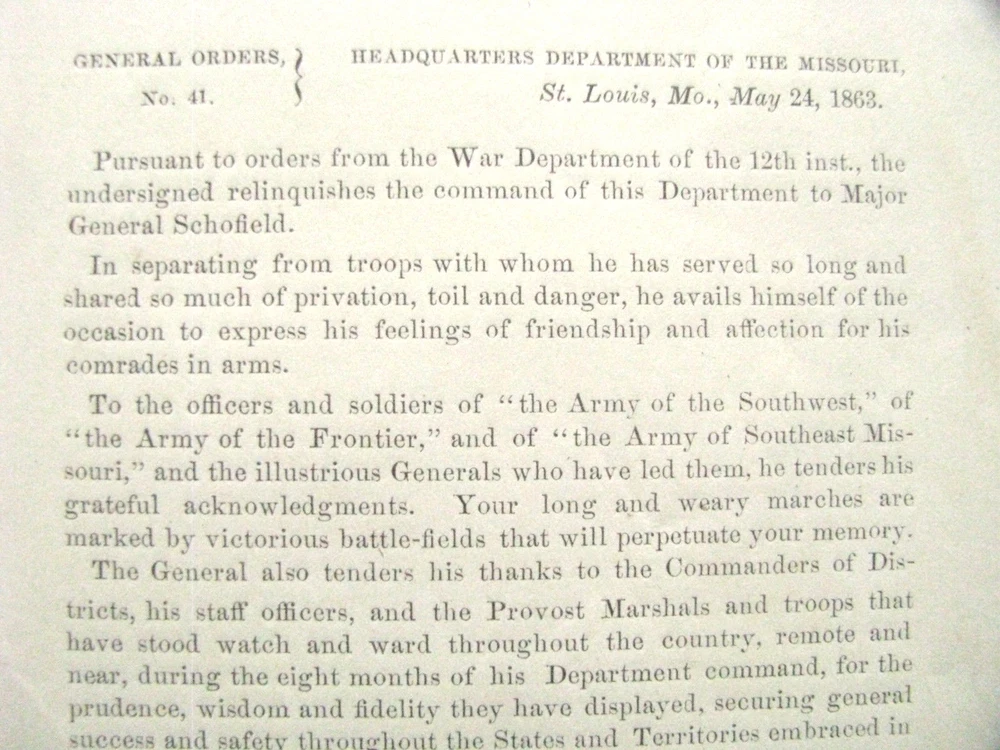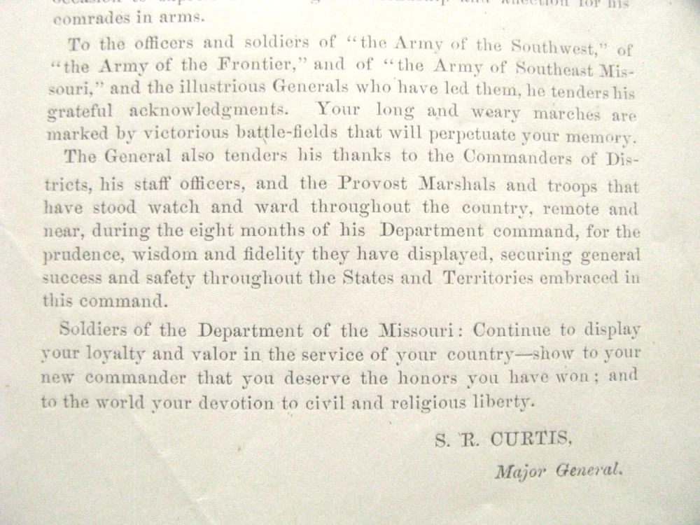 Major General Samuel R Curtis was a notable Frontier US Army officer and Keokuk, Iowa Pioneer who raised the 2nd Iowa Infantry in 1861, commanded the Union Forces in Missouri incl the Battle of Pea Ridge Arkansas, and defeated Price's Army in Missouri. An original Civil War General Order from General Curtis, HQ, Dept of the Missouri, St Louis, May 24, 1863 issuing his Farewell Address, expressing his affection for the Armies of the Southwest, the Frontier, & SE Missouri that he commanded , honoring their fidelity, courage and victories, issued when he relinquished command to General John Schofield. 1p 8 x 5 ptd. Edge wear, age darkening on margins, Overall VG. Comes w service info. General & Special Orders were issued to communicate commands and information to the Army. Each order, issued in writing by a command, was then printed for distribution to each unit, either at an army department headquarter or by commanders at local headquarters, sometimes in the field on portable printing presses. The orders were then issued to regiments, often to be read aloud to the troops. General Orders were printed as issued with date & location; at the end of a year the regimental adjutant might retain them loose or simply string bind them by punching holes and stringing on ¼” red cloth string tape (the source of the old expression "government red tape"). Sometimes an officer or HQ clerk might take a group of orders to a local print shop or bookbinder and have an accumulation bound with leather or cloth covers. Usually, American Military Orders of the 19 th century including Civil War era were printed on an 8 x 5” sheet of quality rag paper. Welcome to my Ebay Auctions and Ebay Store. I am a specialist in early American Military & Historical items, especially American Civil War ephemera- letters, military & historic documents including broadsides, commissions, General Orders and other imprints. I have been collecting and selling original American Civil War & US Military memorabilia for 35 years My customers have included some of the leading names in collecting and selling American History items, as well was as a wide range of novice & advanced collectors in addition to some 30 US federal, state, public and private university & municipal museums and libraries. All items are unconditionally guaranteed to be authentic and in the condition as described. I am a longtime member of the Company of Military Historians, the New England Antique Arms Association, the Ephemera Society of America & the Civil War Veterans Historical Assn. I SELL ONLY ORIGINAL ITEMS, AND HAVE BEEN A PROFESSIONAL FULL TIME SELLER OF ANTIQUE HISTORICAL ITEMS SINCE 1980. PLEASE SEE MY EBAY STORE FOR OTHER LISTINGS. PLEASE READ DETAILS OF THE ITEM DESCRIPTION. I TRY TO DESCRIBE ALL ITEMS ACCURATELY U.S. SHIPPING ONLY I ship only USPS priority mail with insurance If you would like to Add Me as a Seller You Follow, Go to the Seller Information Bar on the Middle Right Side of the Page and click ‘Follow This Seller”