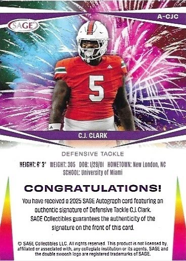 Elevate your collection with the 2025 Sage Low Series Autographed Card featuring C.J. Clark of the Miami Hurricanes. A must-have for enthusiasts, this card is a testament to Clark's prowess on the gridiron, capturing the spirit of collegiate football competition. The 2024 season shines through with an authentic autograph from Clark himself, adding a personal touch to this collectible. The card, numbered A-CJC, is part of the esteemed 2025 SAGE set known for its quality and prestige among collectors. As an original piece, it comes in standard card size with English language detailing. Whether you're a fan of the Miami Hurricanes, a follower of C.J. Clark's rising career, or a connoisseur of NCAA memorabilia, this card is an essential addition to your sports trading card collection.