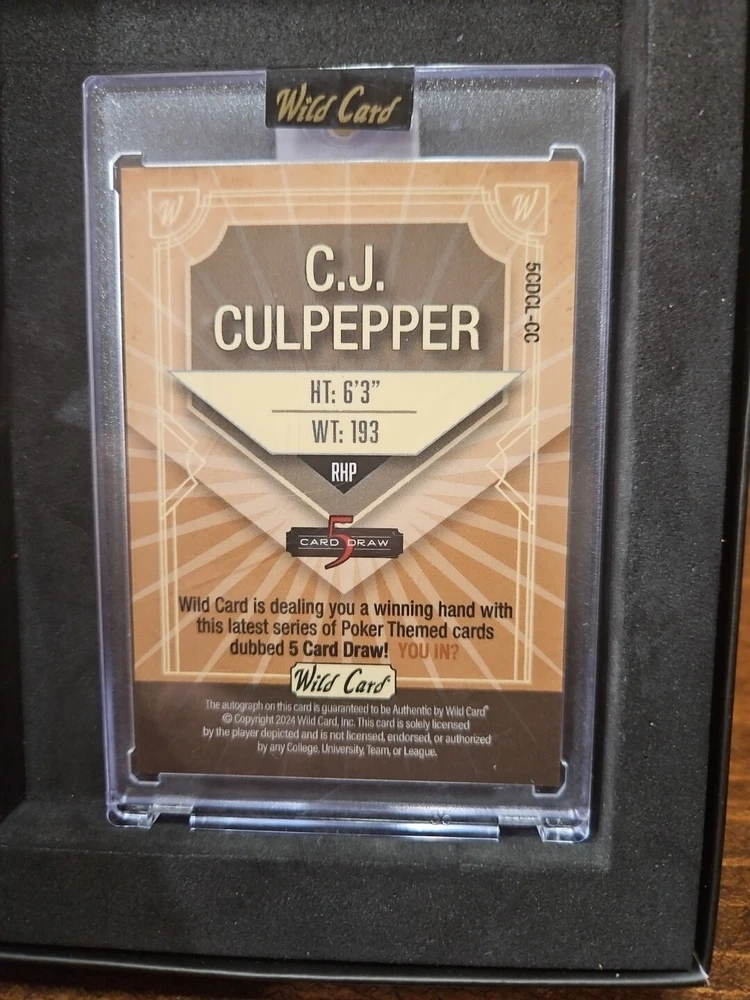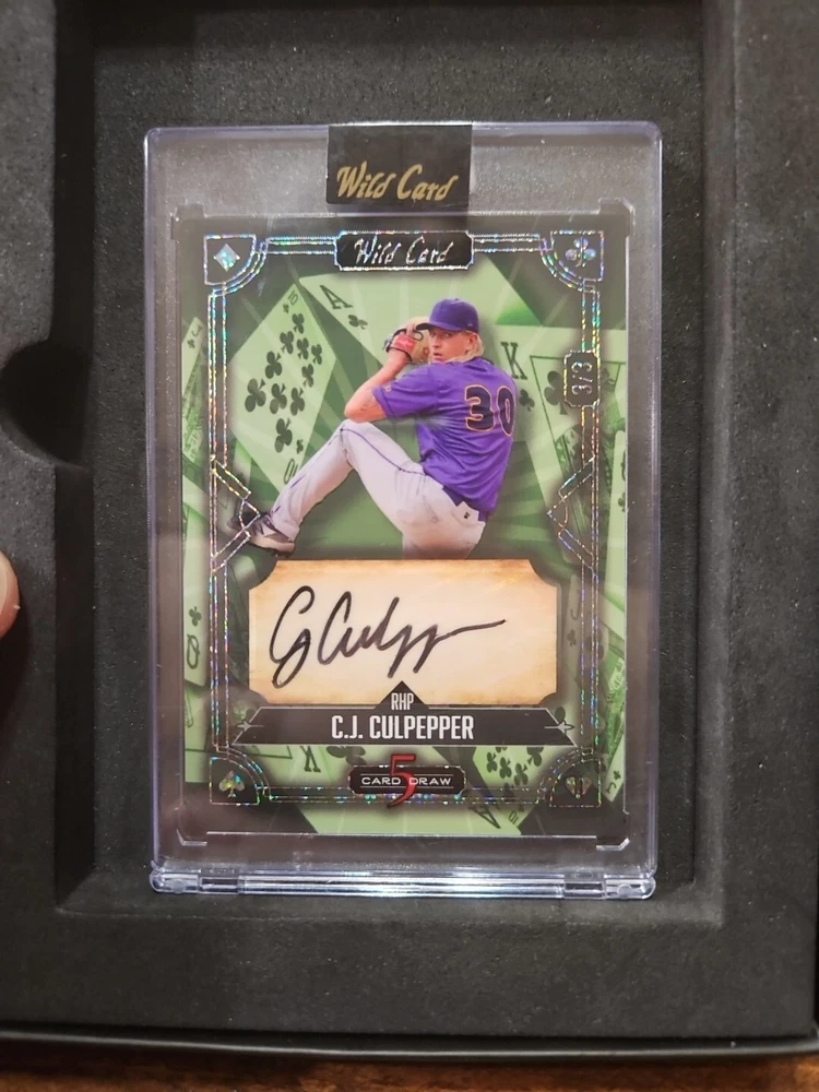 The trading card is an autographed C.J. Culpepper card from the 2024 Wild Card 5 Deck Draw baseball set. It features a green parallel variety and is in near mint or better condition. The card is from the Major League (MLB) and is manufactured by Wild Card. The card number is 5CDCL-CC, making it a valuable addition for fans of baseball trading cards.