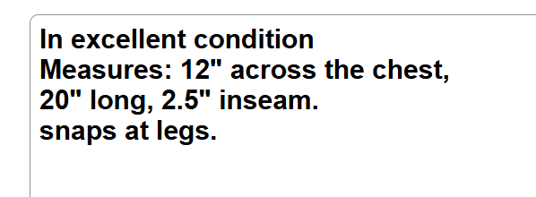 In excellent condition Measures: 12" across the chest, 20" long, 2.5" inseam. snaps at legs. THANK YOU EBAY!!! We are so thankful for our customers! We have thousands of listings, and therefore receive hundreds of messages, every single day. So, if you are asking about a price drop, or a shipping price drop, or asking for extra measurements, or to add additional photos, please allow me to answer you here, No thanks. If your question is not one of those questions, we will be happy to answer you individually. YES...WE DO COMBINE DOMESTIC SHIPPING. Extra jewelry items ship for $2 each (except for large jewelry lots). We will refund the difference as we are mailing out.....we hope you enjoy shopping with us! We encourage you to read the description and check all photos.